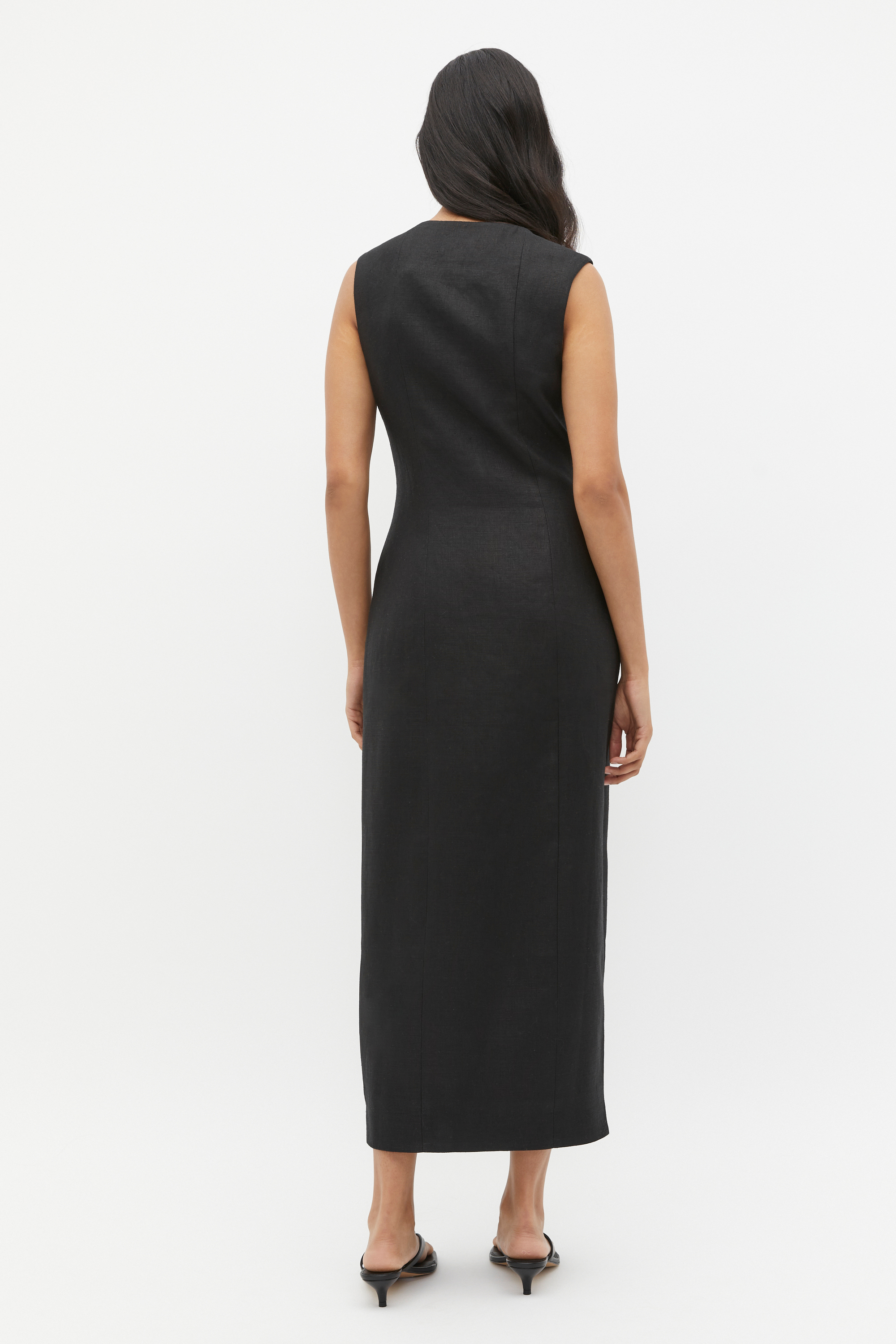 Chic and effortlessly on-trend, this dress is set to slot right into your summer wardrobe. Crafted in premium linen, it features a round neck and a button front in a sleeveless paneled design.