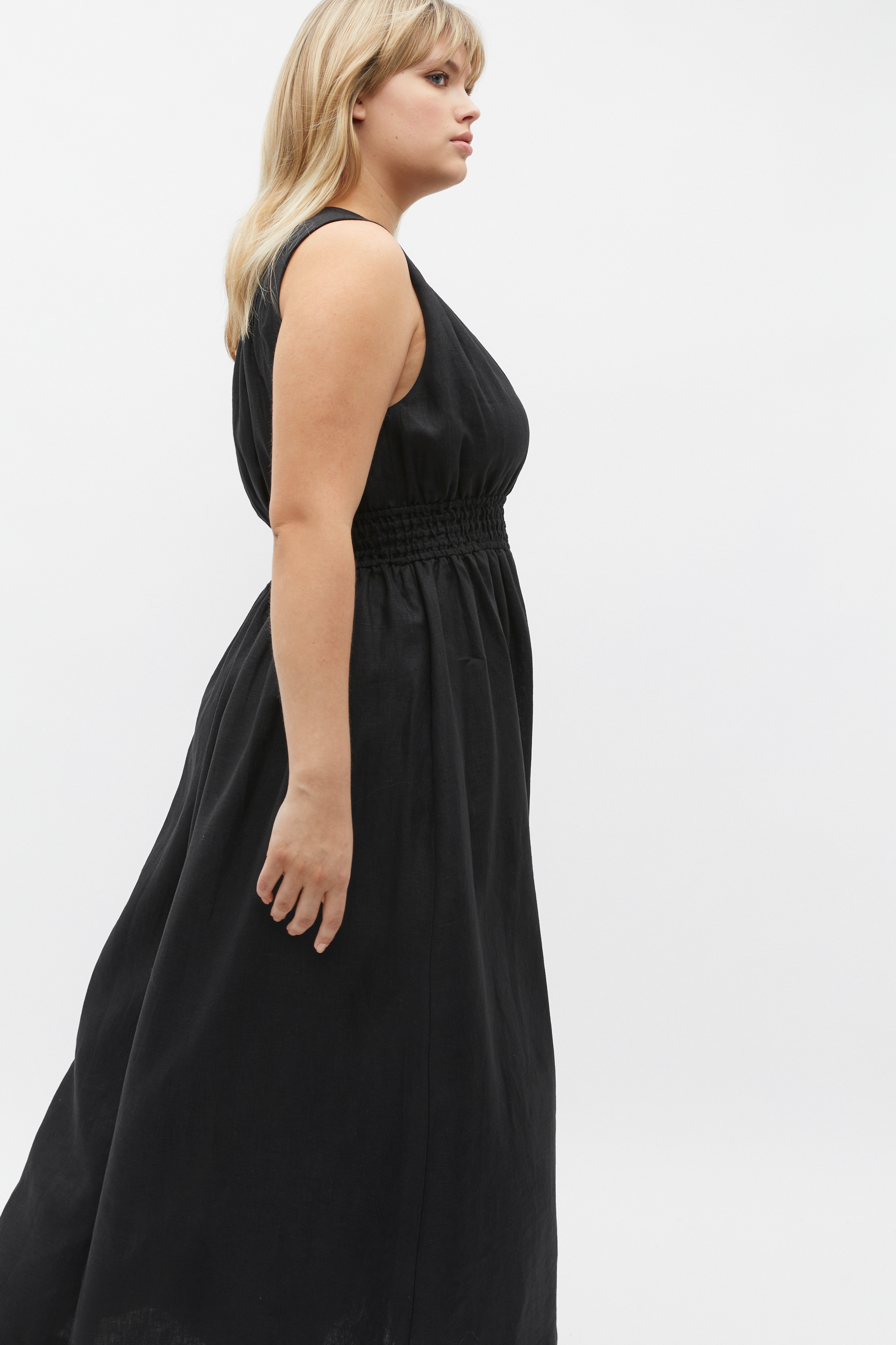 An instant outfit for those warmer days, this linen dress features a shirred waist detail, sleeveless construction and a full A line skirt.