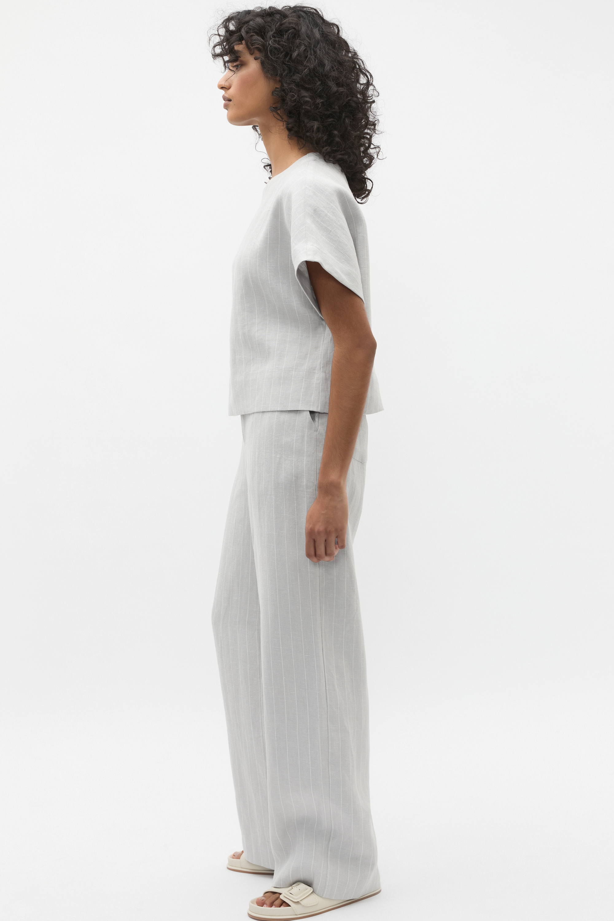 Elegantly finished in a classic pinstripe, these pants are a lightweight design, perfect for your holiday wardrobe. Crafted in premium linen, they feature a fixed waistband with a zip front, pockets, and a subtly wide leg shape. Style with the coordinating linen pieces for a curated resort-ready set.