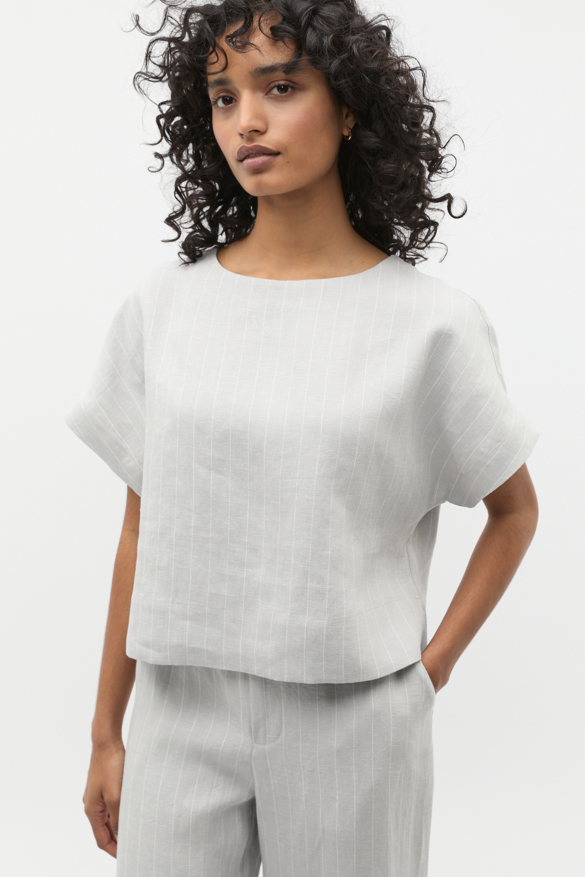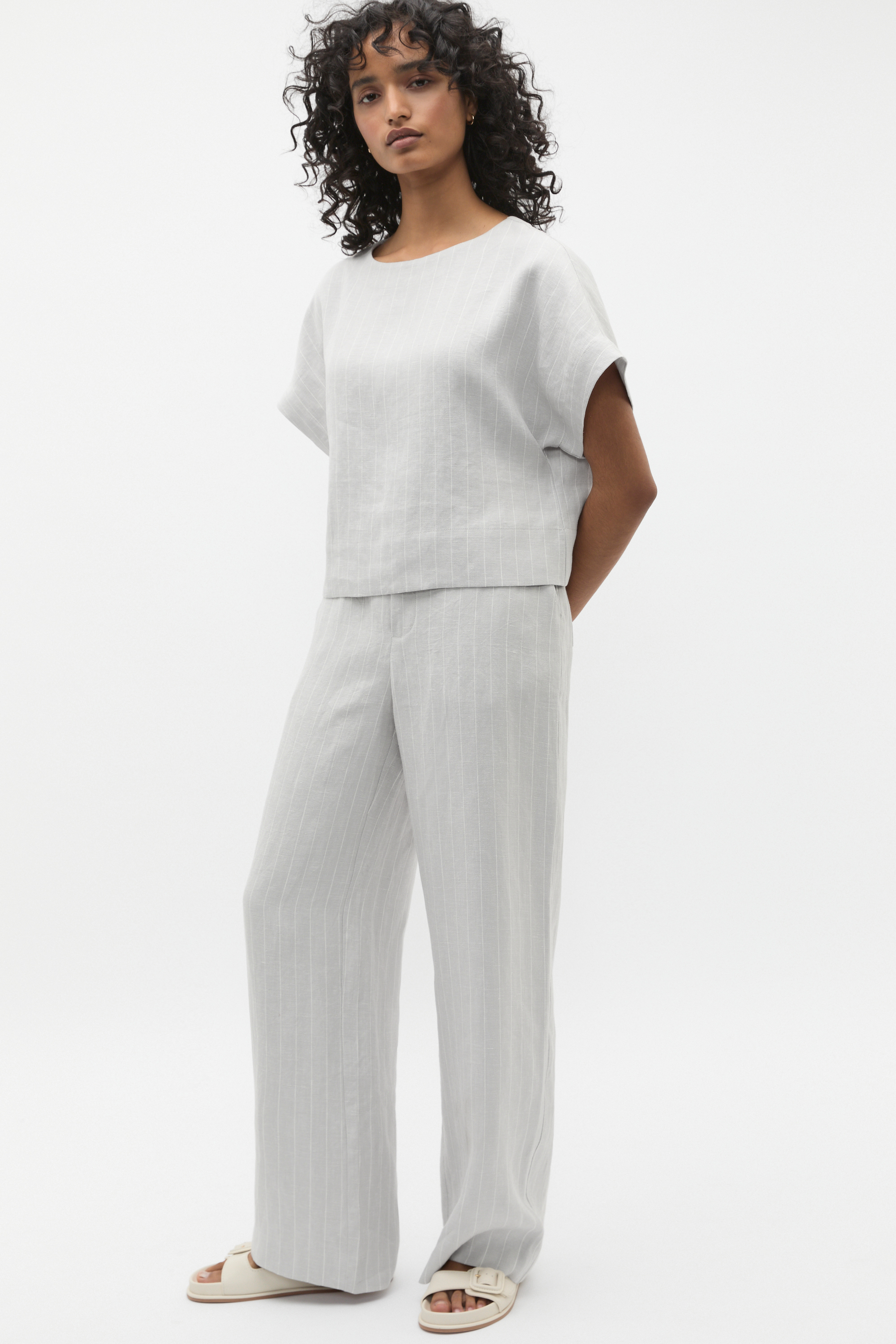 A relaxed style with an elevated take, this tee is perfect for your holiday wardrobe. Crafted in premium linen, it features a round neck, short sleeves, a boxy fit and a pinstripe throughout. It secures with a button at the back of the neck.