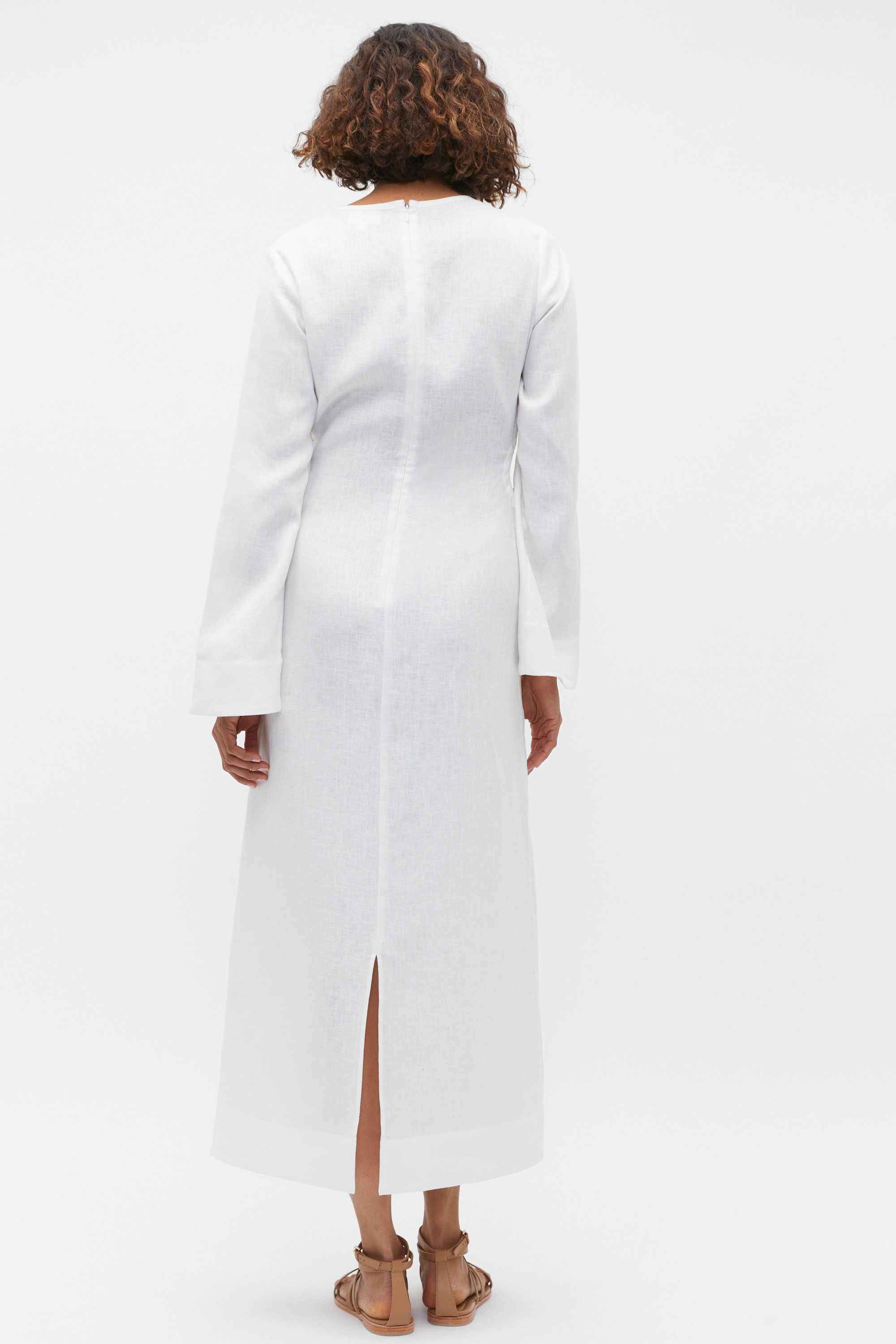An elevated statement in linen, this maxi dress is the ideal piece to update your summer styling. It features a round neck, long flared sleeves and adjustable waist ties for your ideal fit and comfort.
