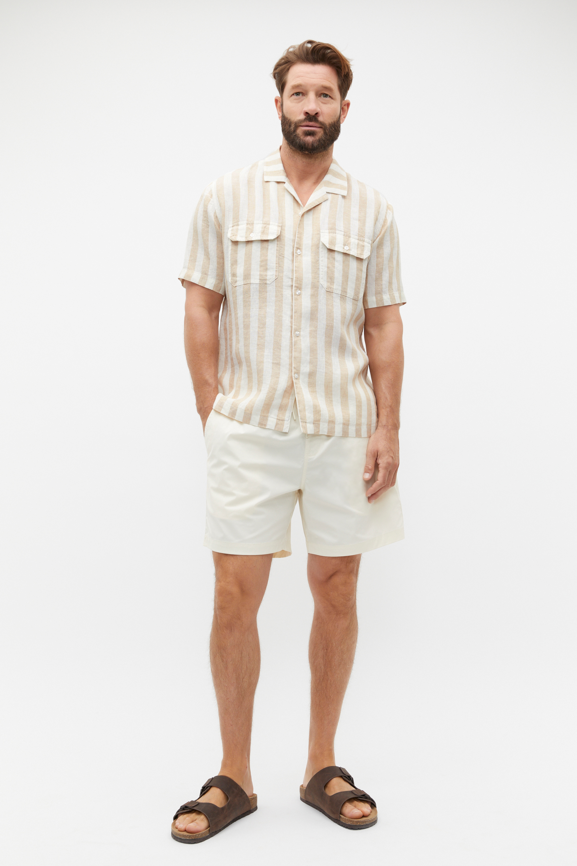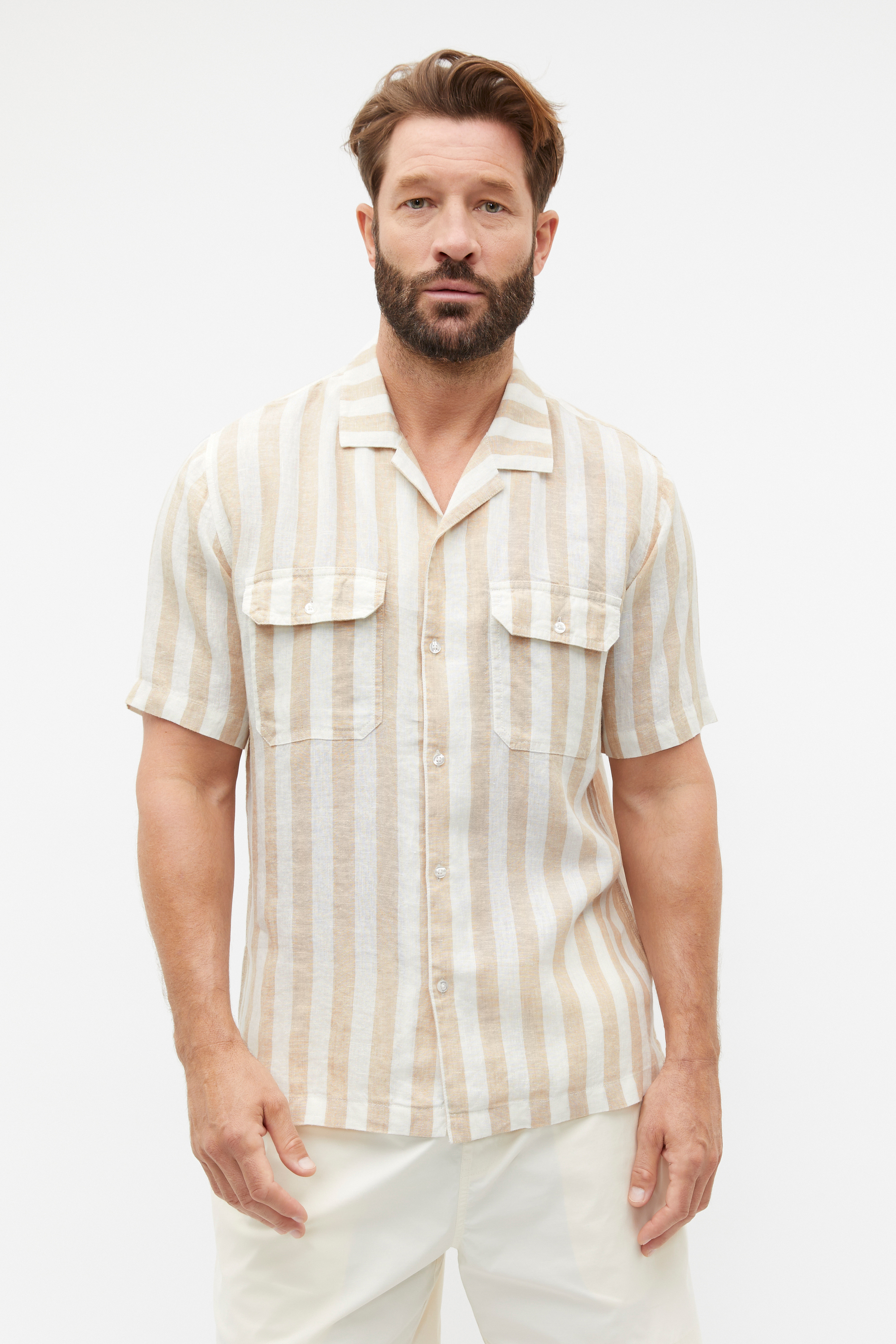 Add a touch of utility to his look with this shirt, crafted from premium linen. With a boxy fit, it features a notched collar, a button front, duo patch pockets, and short sleeves.