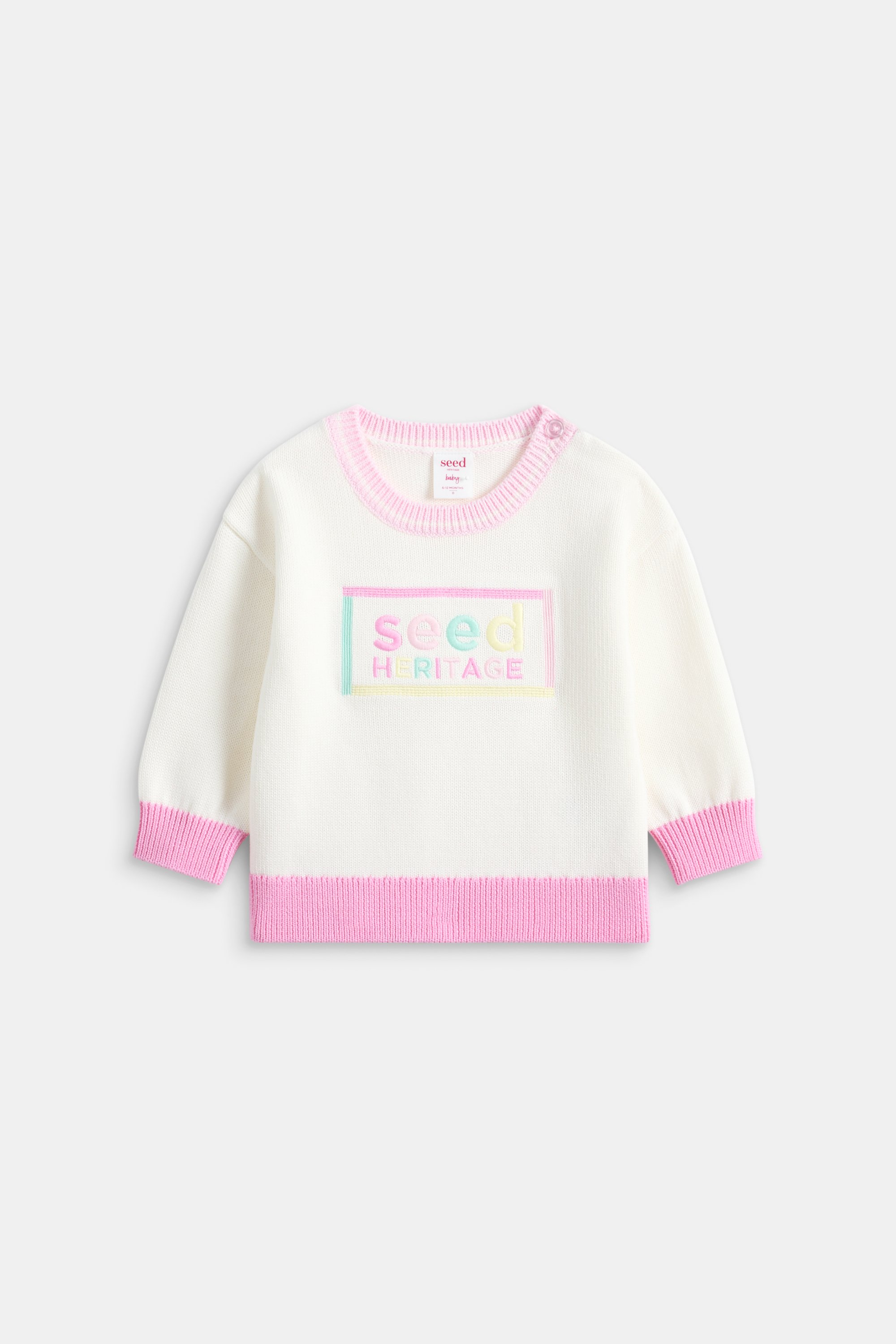 Add some colour and fun to her everyday wardrobe with this adorable retro sweater. Crafted in premium cotton with a soft knit finish, it features a round neck with a contrast collar, long sleeves and a colourful embroidered Seed Heritage logo.