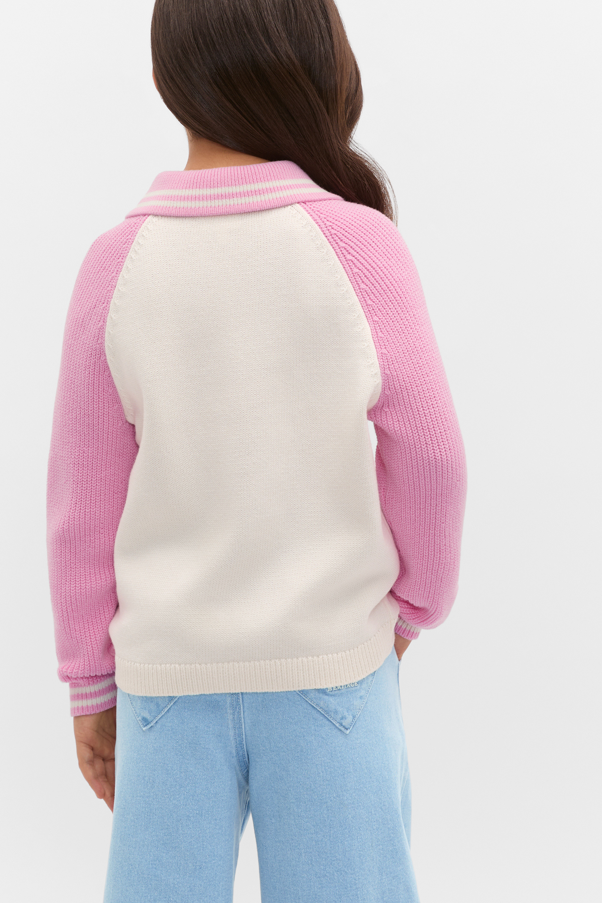 Versatile and cute, this sweater has a retro sporty feel, perfect for her active days. It's crafted in premium cotton with a knit finish and features a zip collar with a contrast stripe detail, long raglan sleeves and an embroidered Seed Heritage logo.