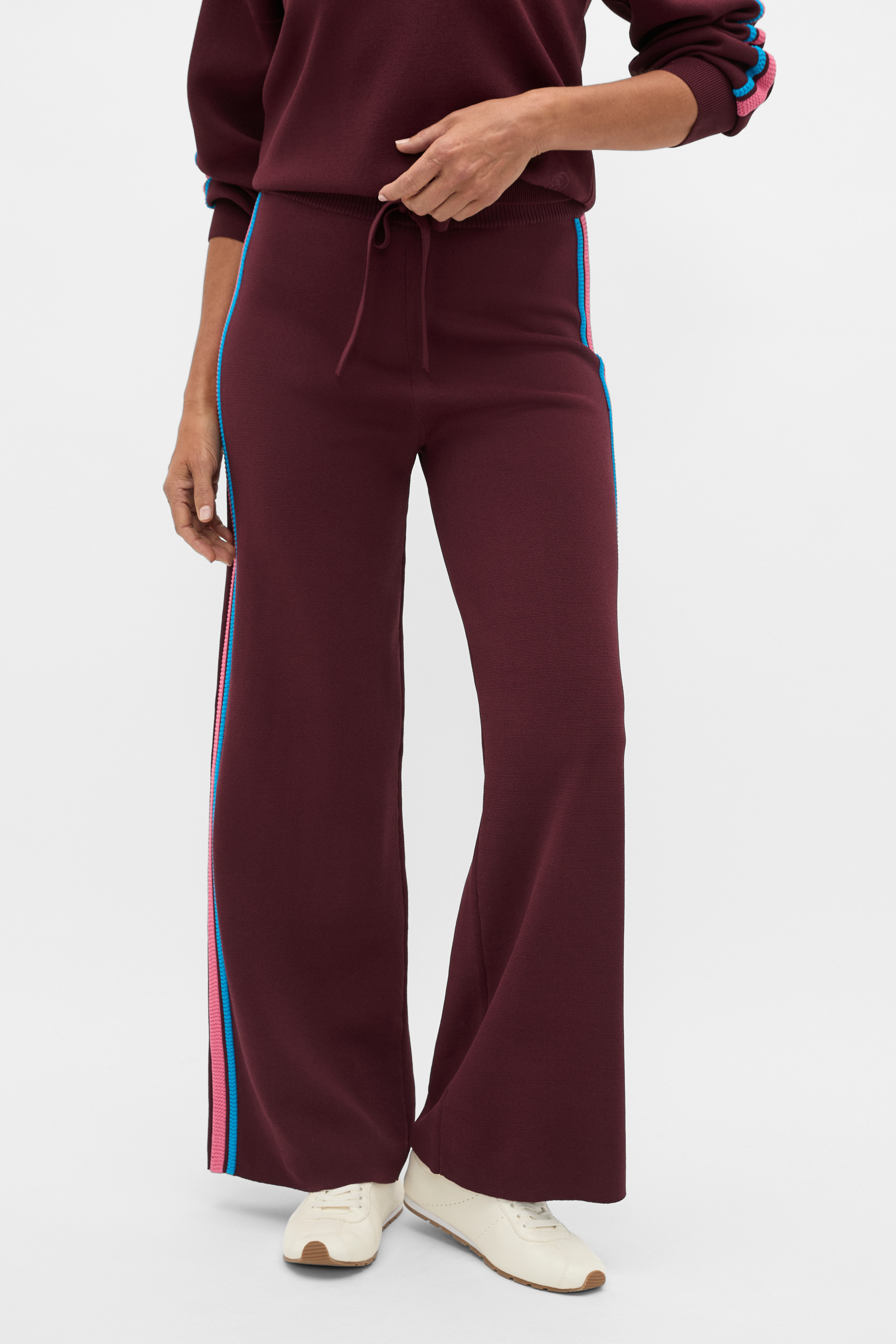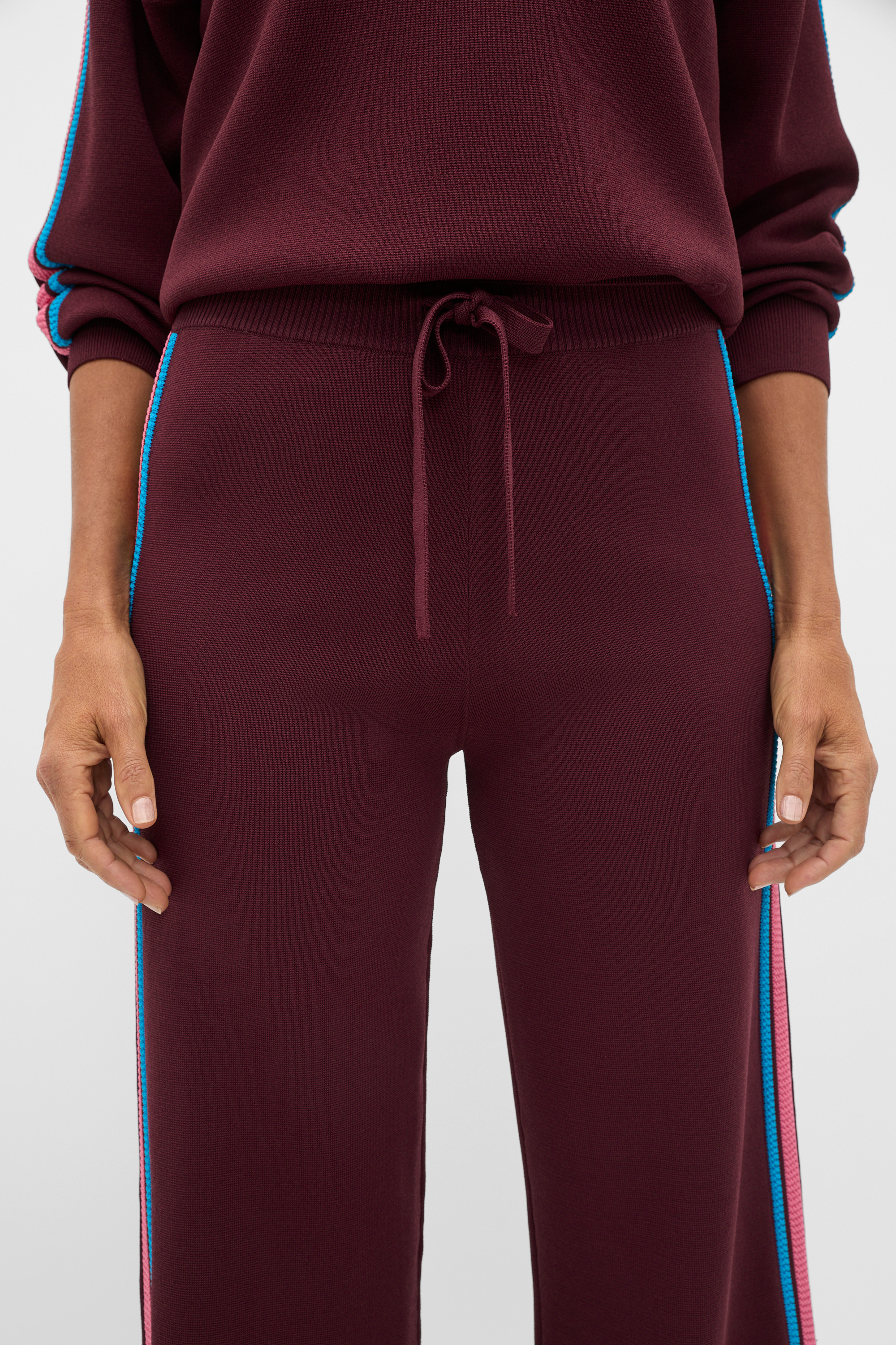 A chic take on sportswear, these knit pants are set to be your go-to for everything from downtime to days out. They feature a comfortable elasticated waistband and a contrast stripe design. Pair with the coordinating crepe knit sweater for a head-to-toe look that feels easy, and looks put-together.