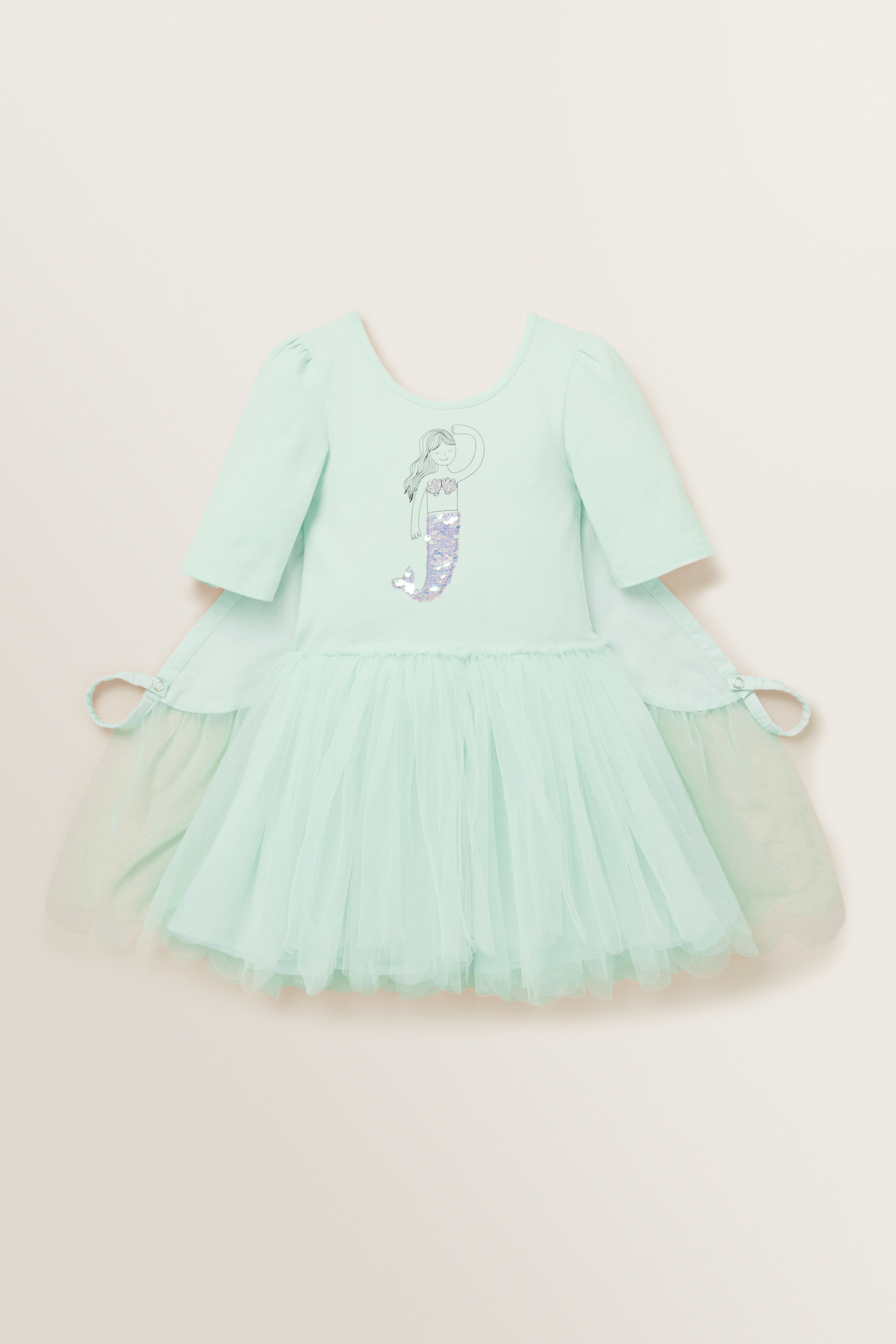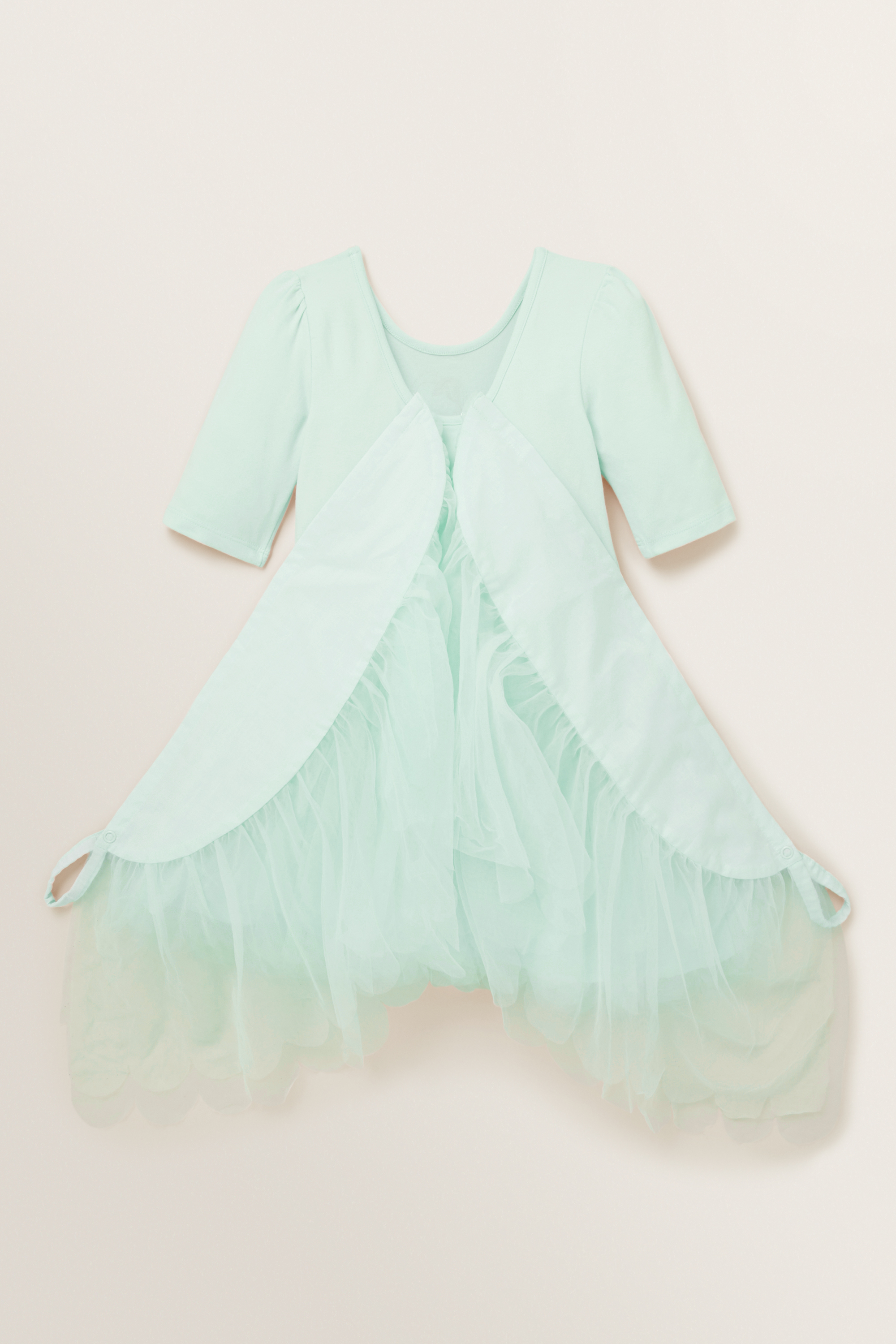 This Mermaid Tutu Dress features a detachable set of wings, full layered tulle skirt and glitter accents for added interest.