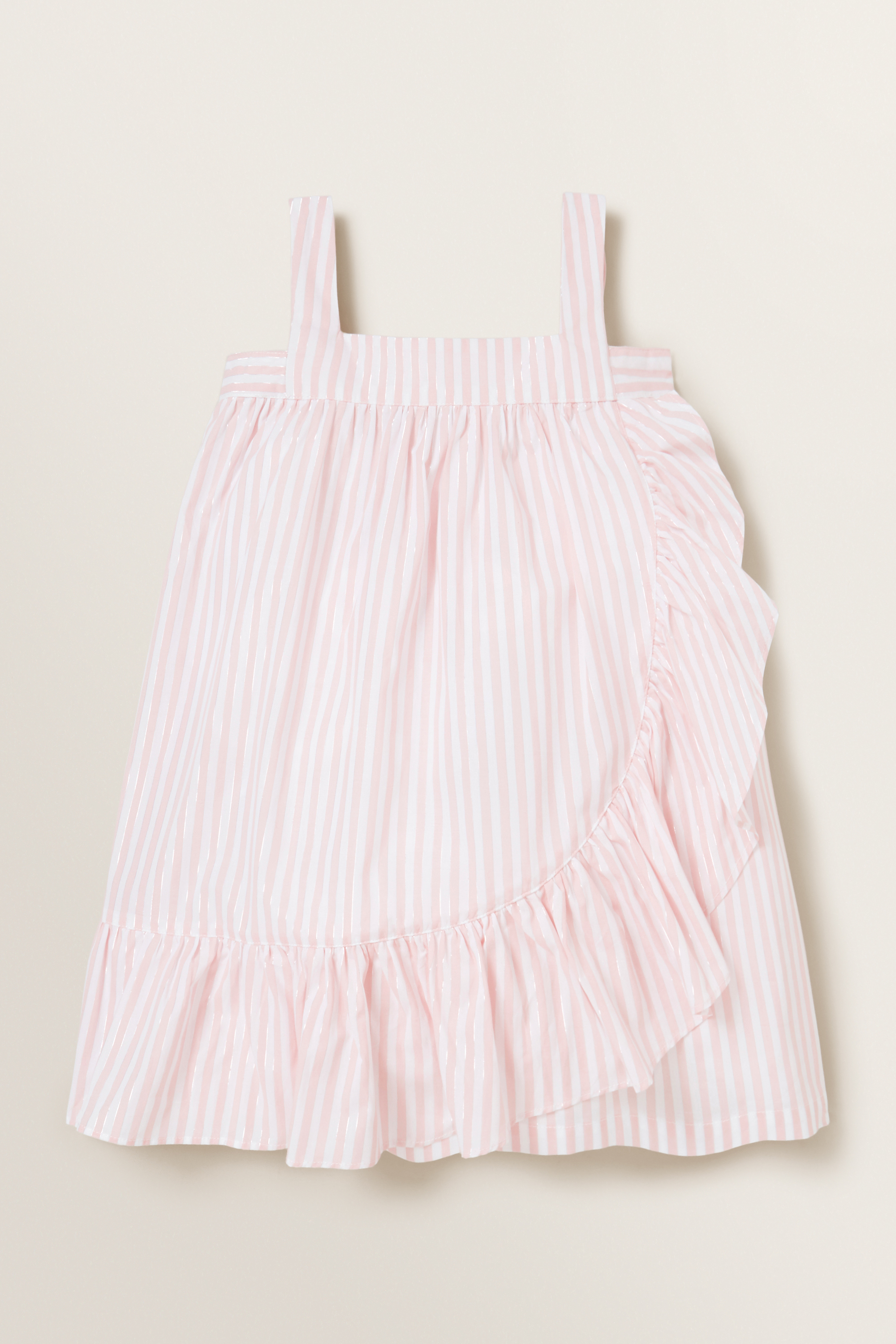 Crafted from a lightweight blend, this Metallic Stripe Dress is accented with shoulder straps, square neckline, flowy silhouette and cascading frill trims. For care instructions, check the label inside of the garment.