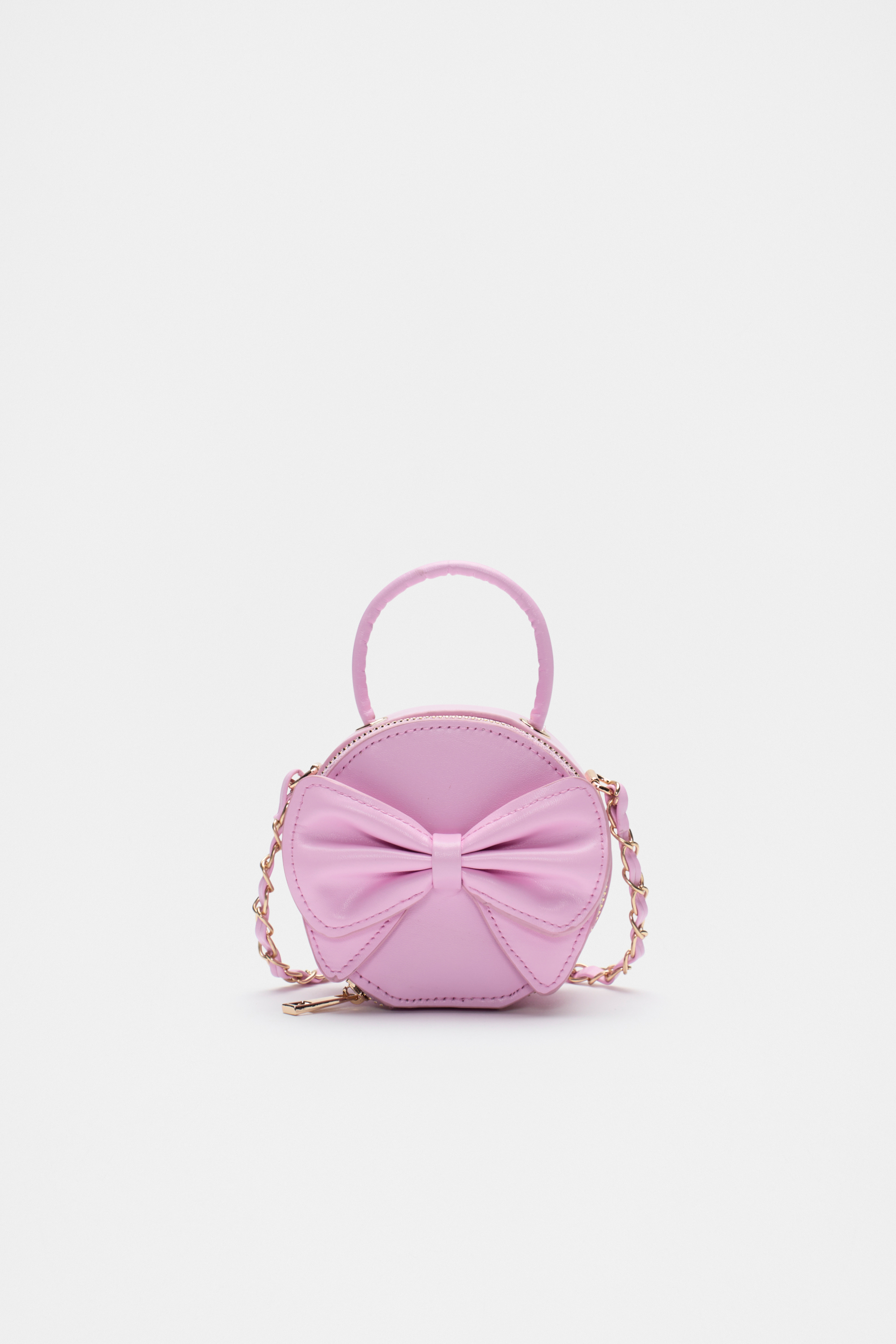 Perfect for special occasions, this bag features a braided chain crossbody strap, a short top handle, and a zip closure. With a puffy bow design, it can be worn with the matching shoes and hair accessories for a complete set.