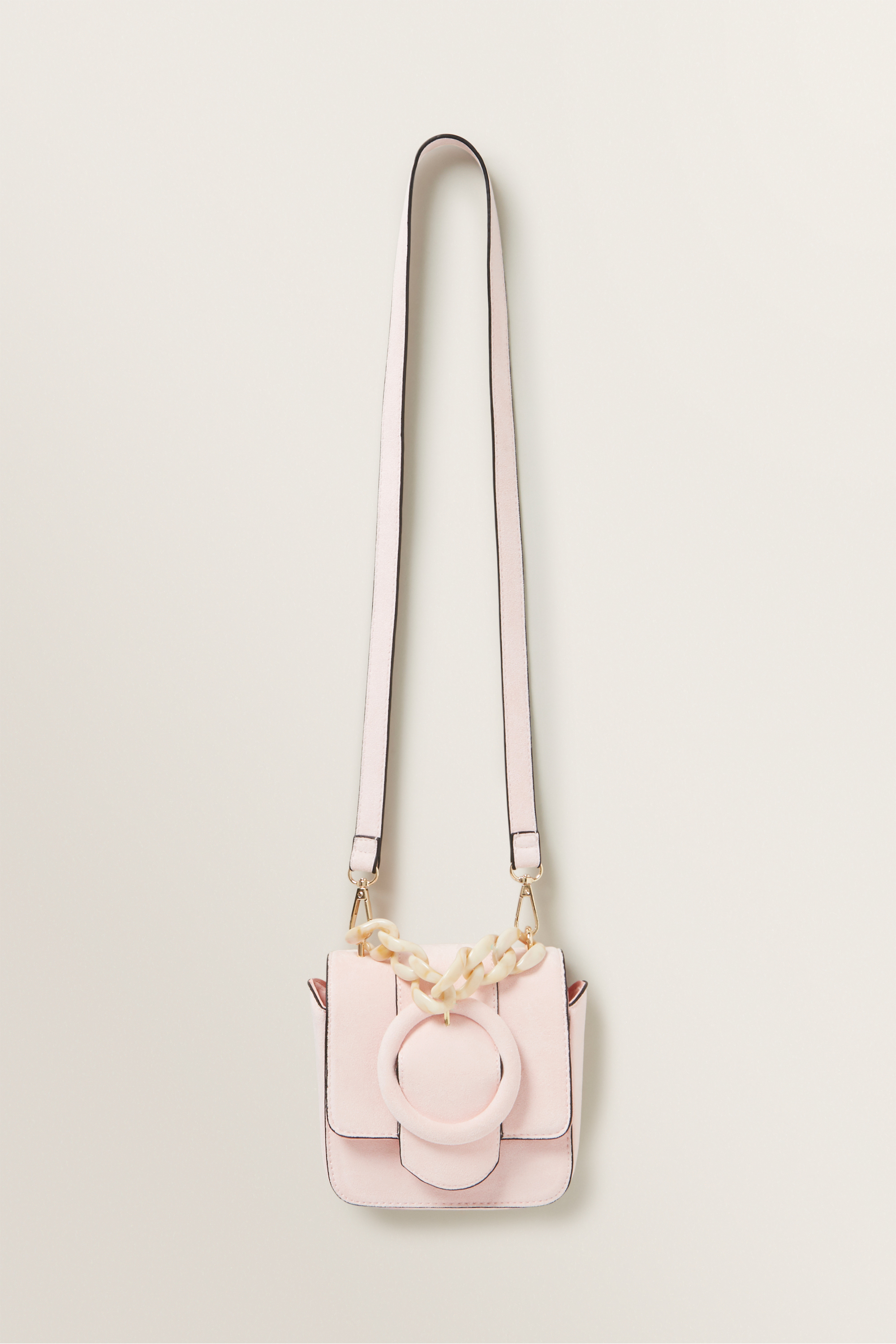 Perfect for partying, this Mini Tort Flap Bag features a faux suede exterior, acrylic chain, removable strap, and a secure magnetic clip closure.