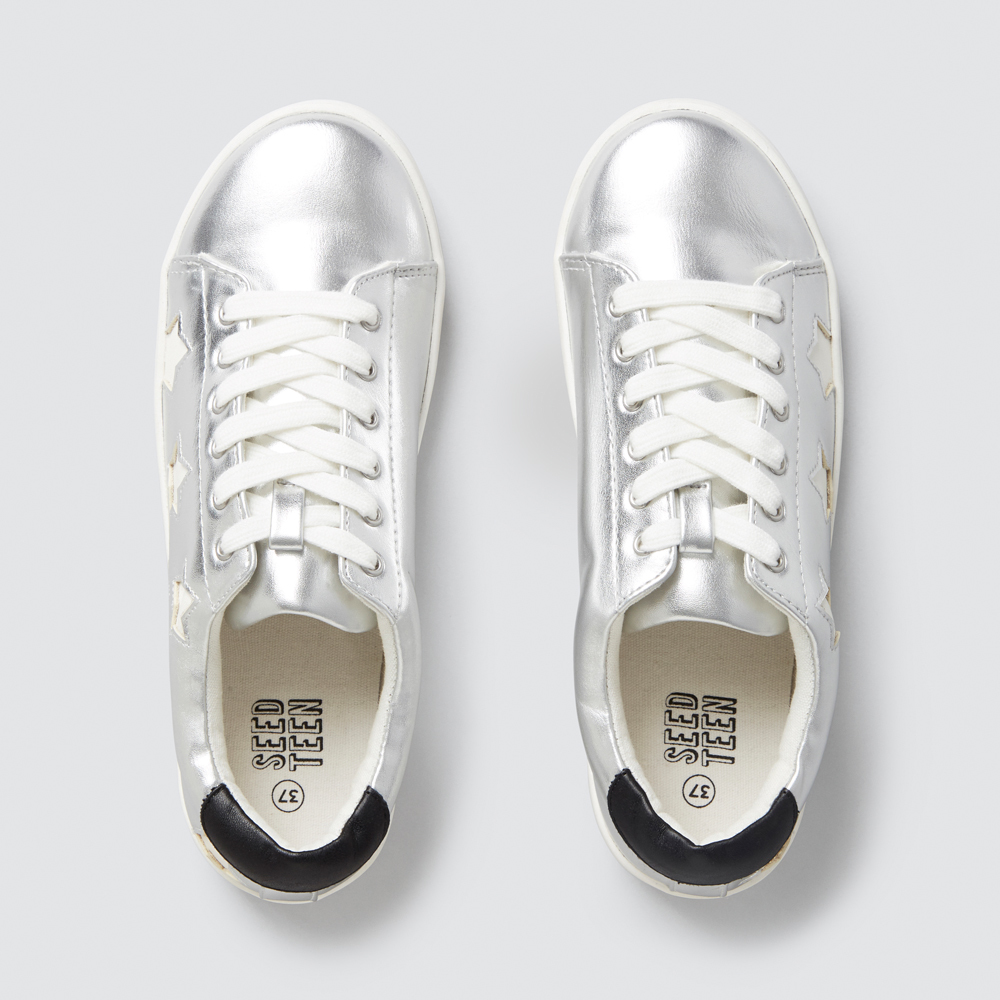 This whimsical teen trainer is perfect for budding streetstyle stars. In a lace-up design with a padded silver body and fun white star pattern, it can be dressed up or down for maximum versatility. Made with a PU upper and a synthetic sole, this piece is available in Metallic and in sizes 34 to 40.