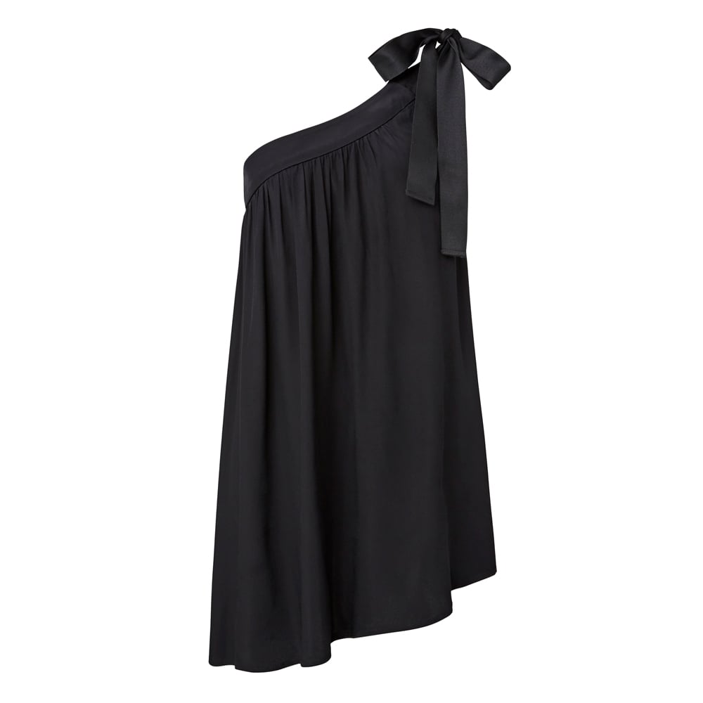 Viscose One Shoulder Top. Relaxed fitting style features one shoulder neckline with adjustable tie detail, and floaty body. Available in Black as shown.