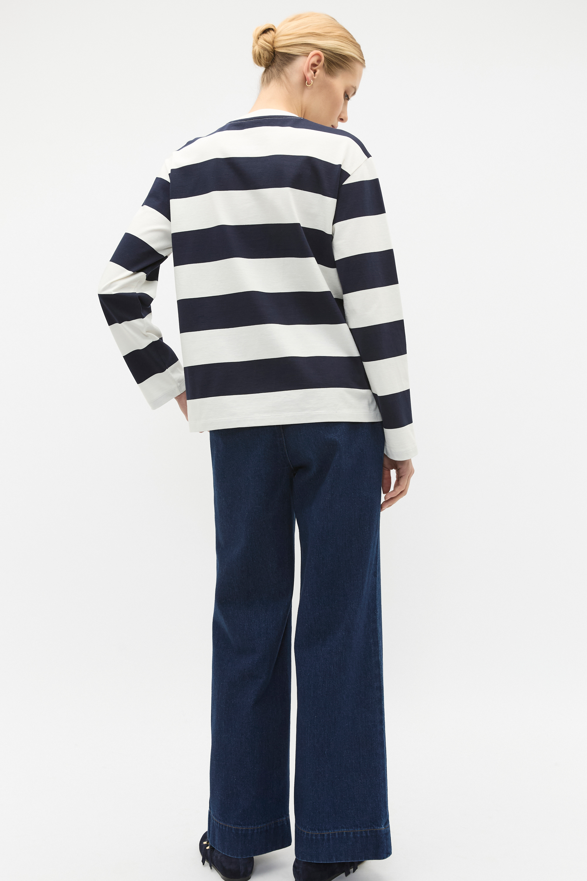 An effortless style for your everyday cool, this top is finished with a timeless bold stripe. Crafted in premium cotton, it features a round neck, long sleeves and a relaxed, oversized fit. By choosing our cotton products you're supporting our investment in Better Cotton's mission. This product was sourced via a system of mass balance and therefore may not contain Better Cotton.