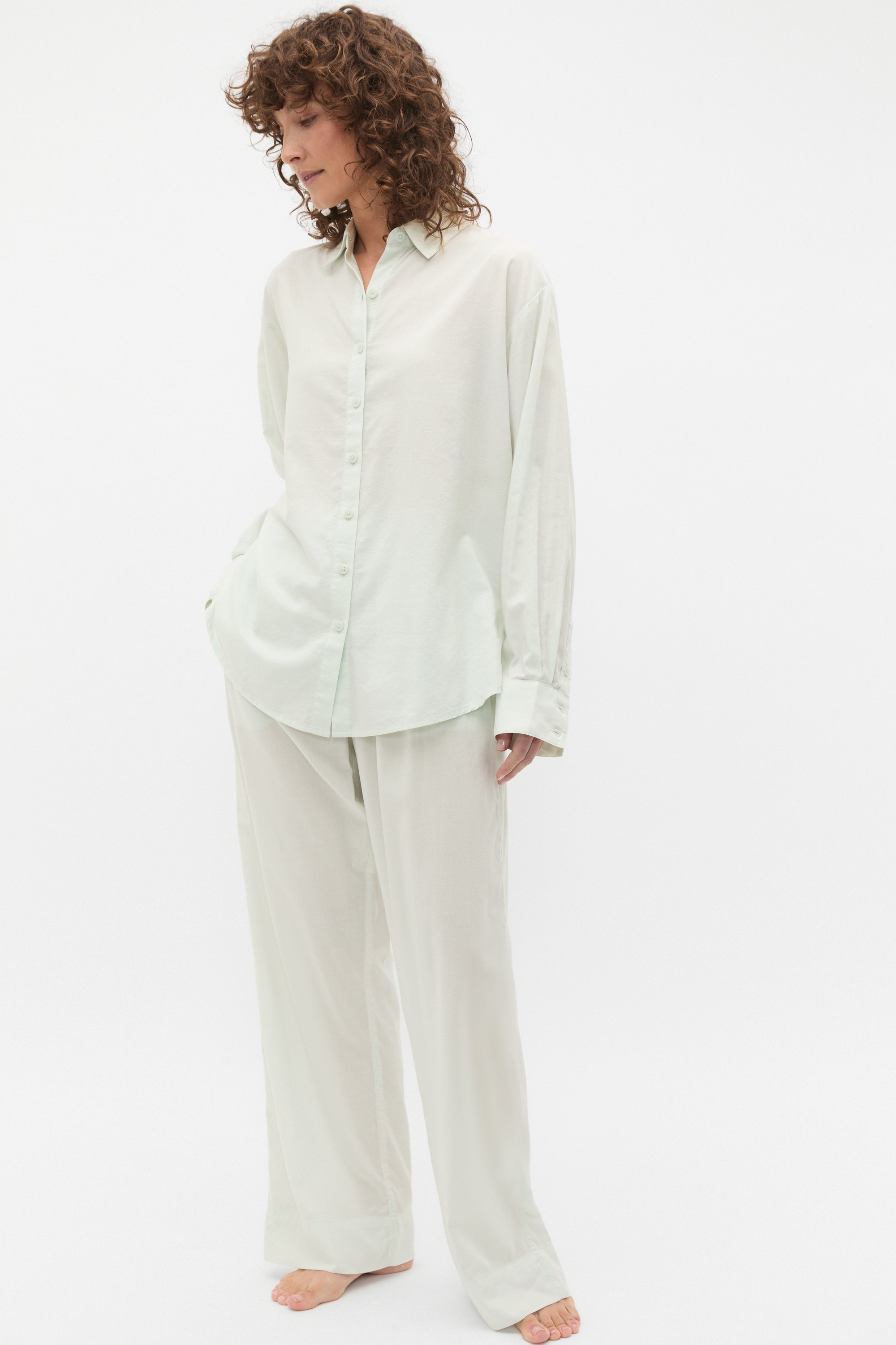 Finished in a lightweight voile, these pyjamas offer maximum comfort and elevated ease to your days and nights. Crafted in a soft blend containing cotton, they feature a collared, long sleeve shirt, and wide leg pants with a comfortable elasticated waistband.