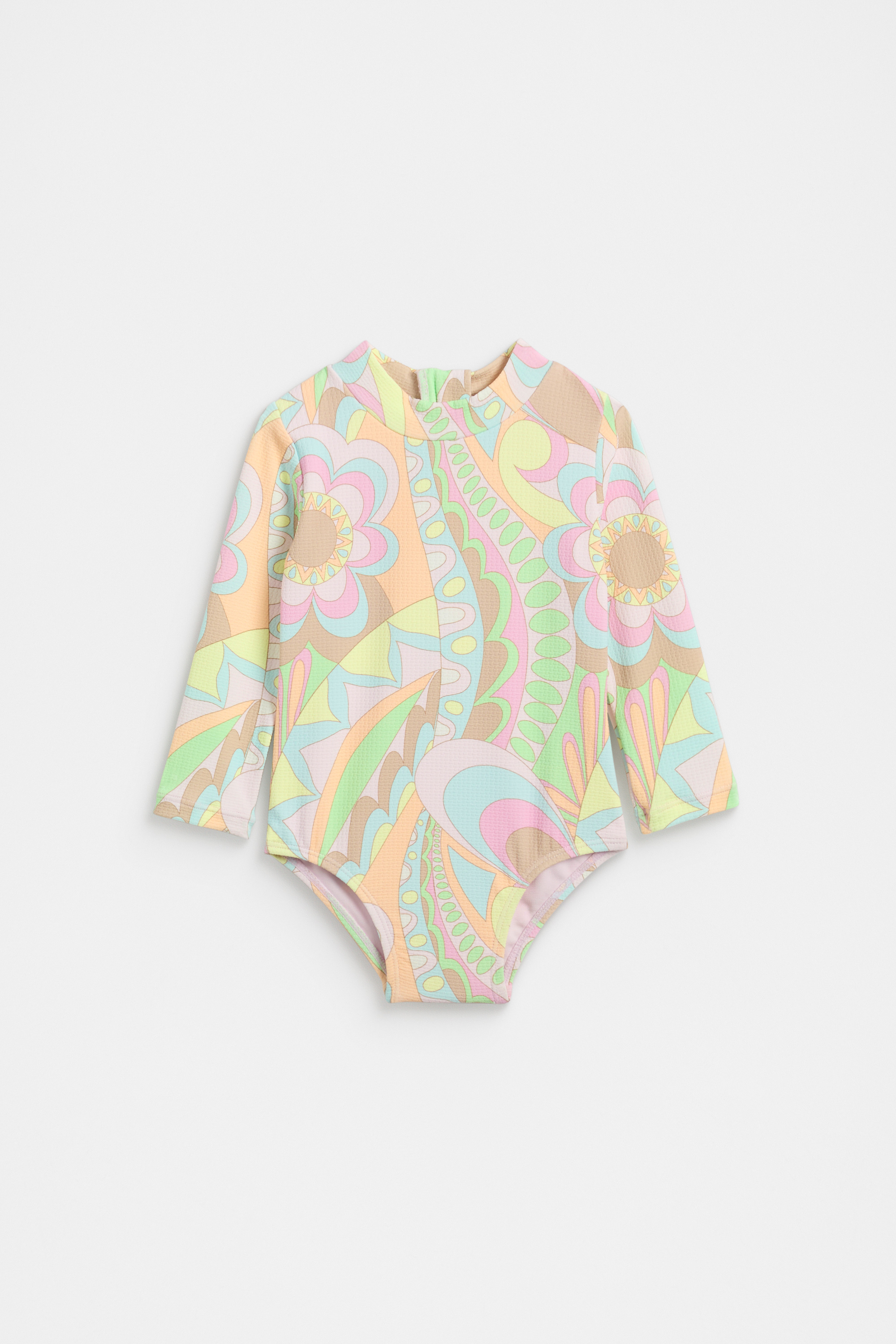 Ready for a summer in the pool, this swimsuit features a brightly coloured design. It features a round neck, long sleeves, and the cutest paisley print. Secures at the back with a zip. Pair with the matching swim hat for the cutest swim-day set, or for the perfect gift.