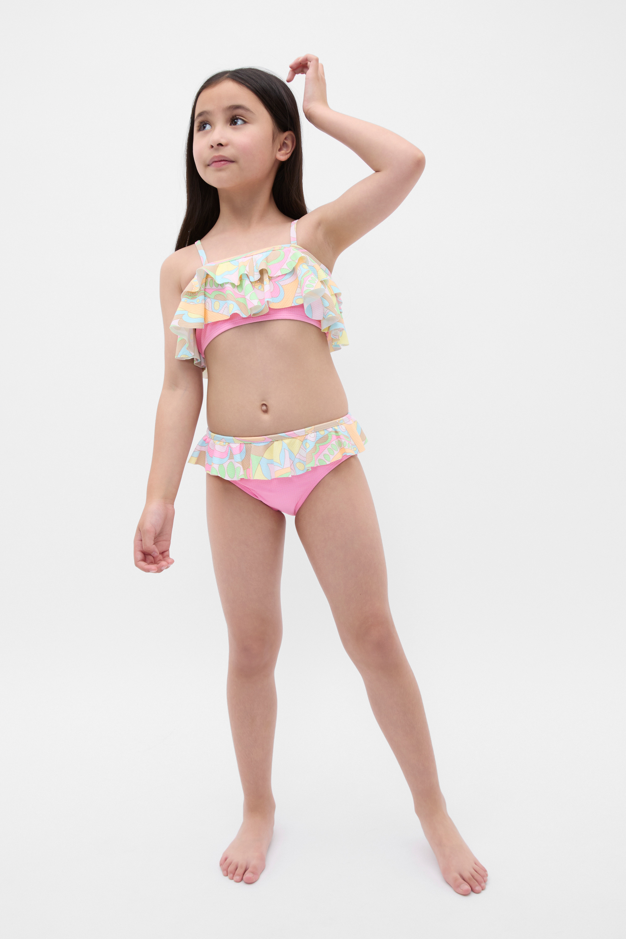 Brighten her day at the pool or beach with this colourful ruffle bikini. It's a two-piece set and features ruffle trims, adjustable straps and the sweetest paisley design.