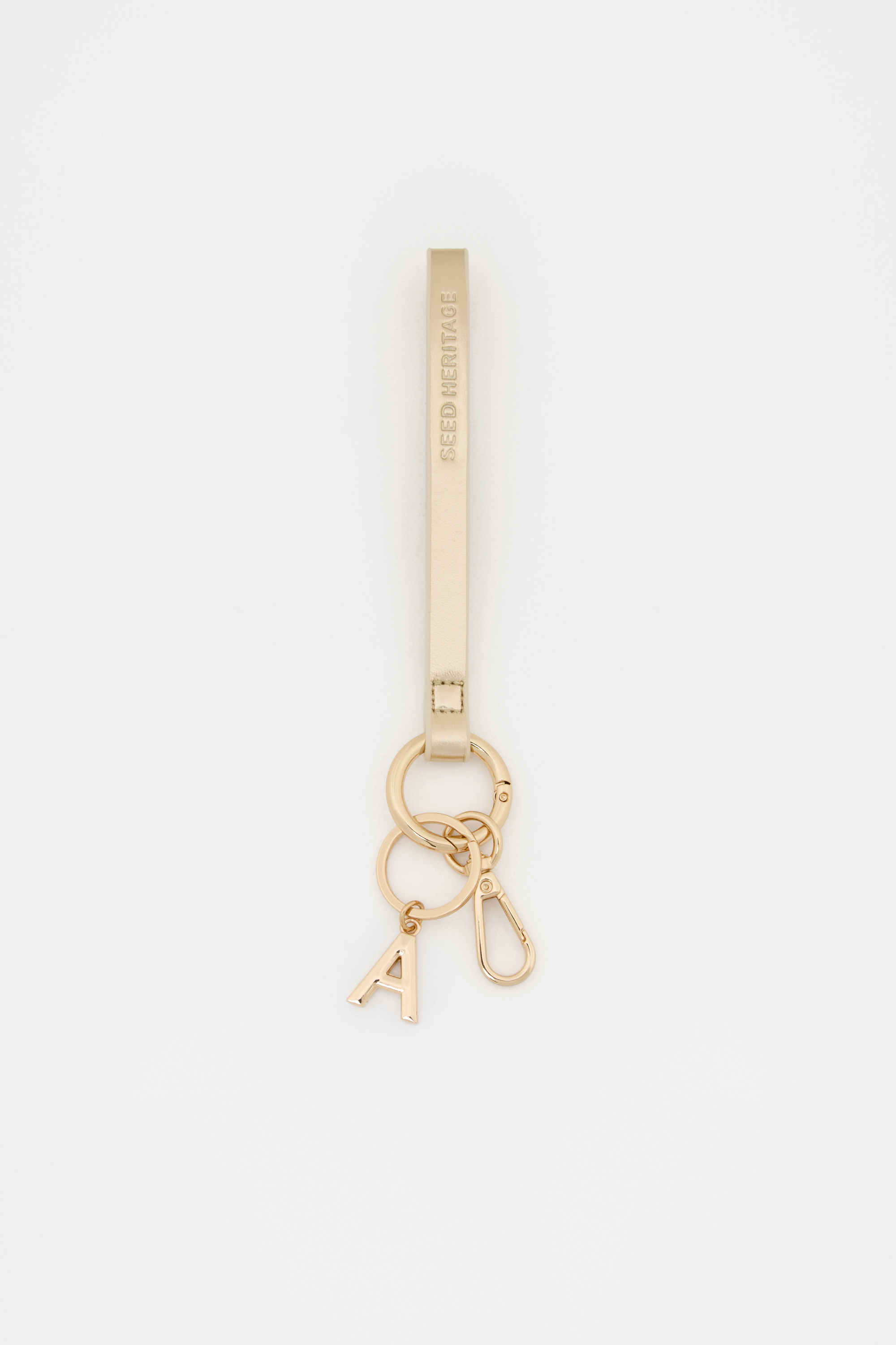 Add a personalised touch to your essentials with this key holder, handily featuring a wrist strap for easy carry. It features gold-tone hardware, Seed logo and an initial or heart charm. Attaches with a parrot clasp.