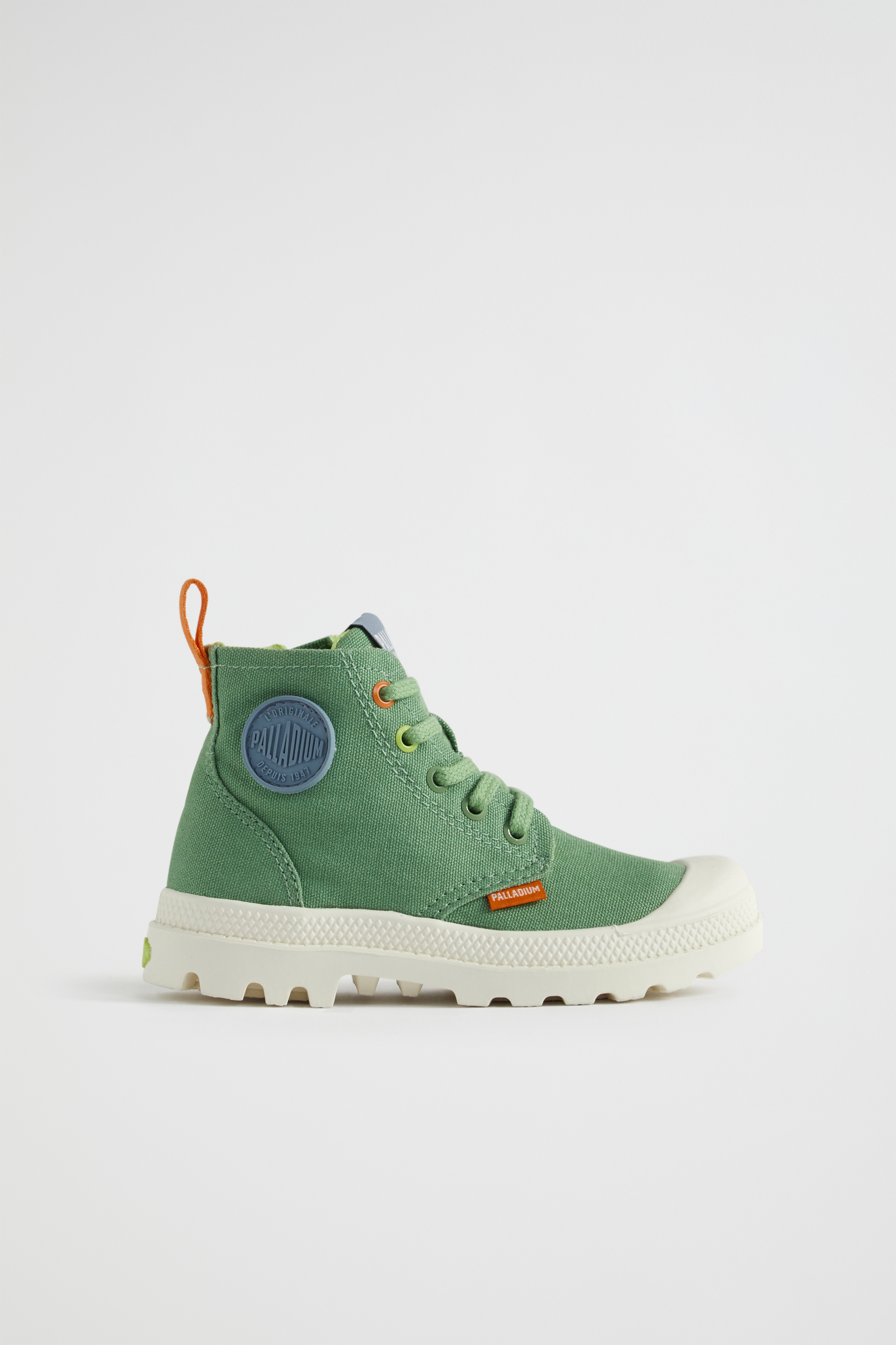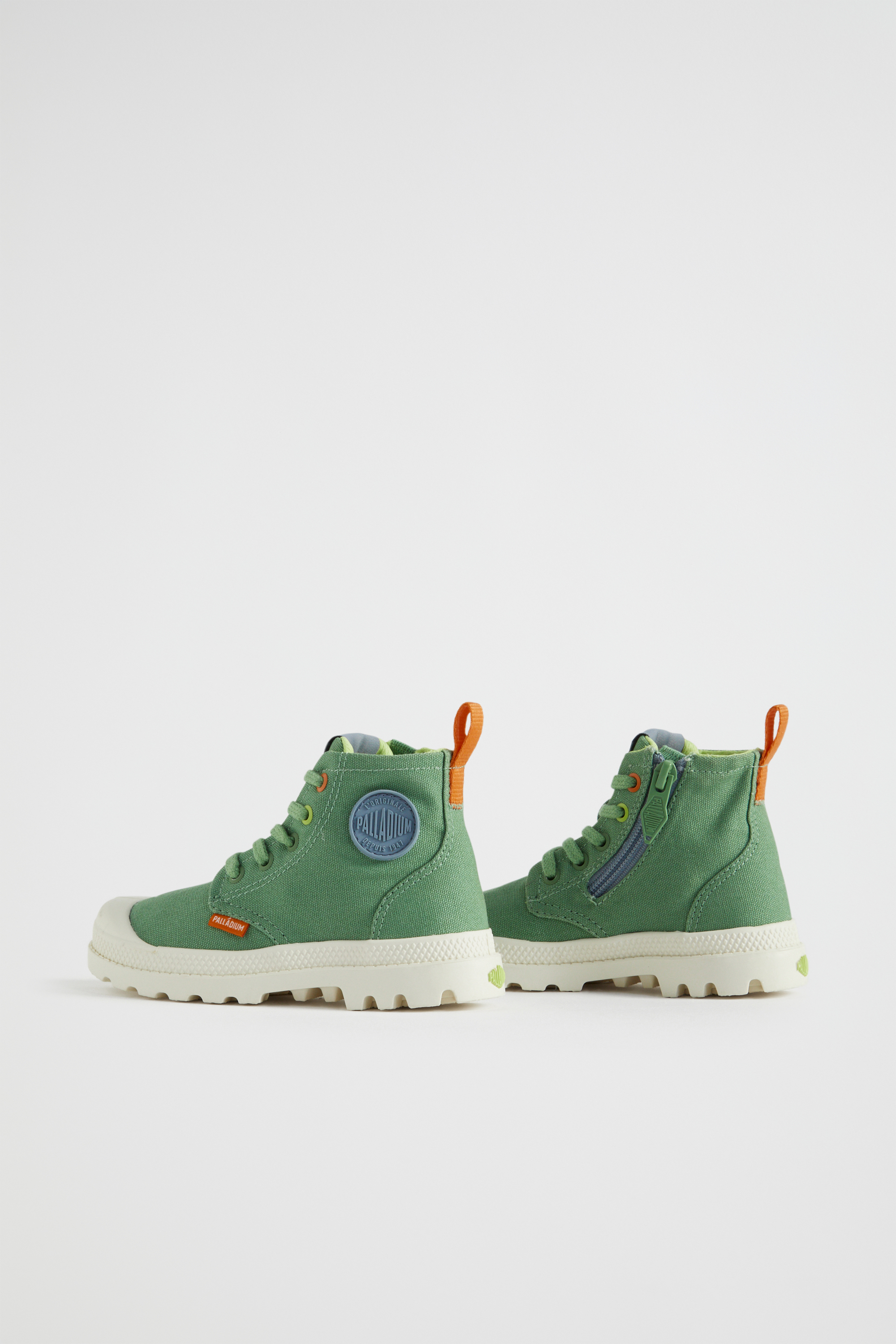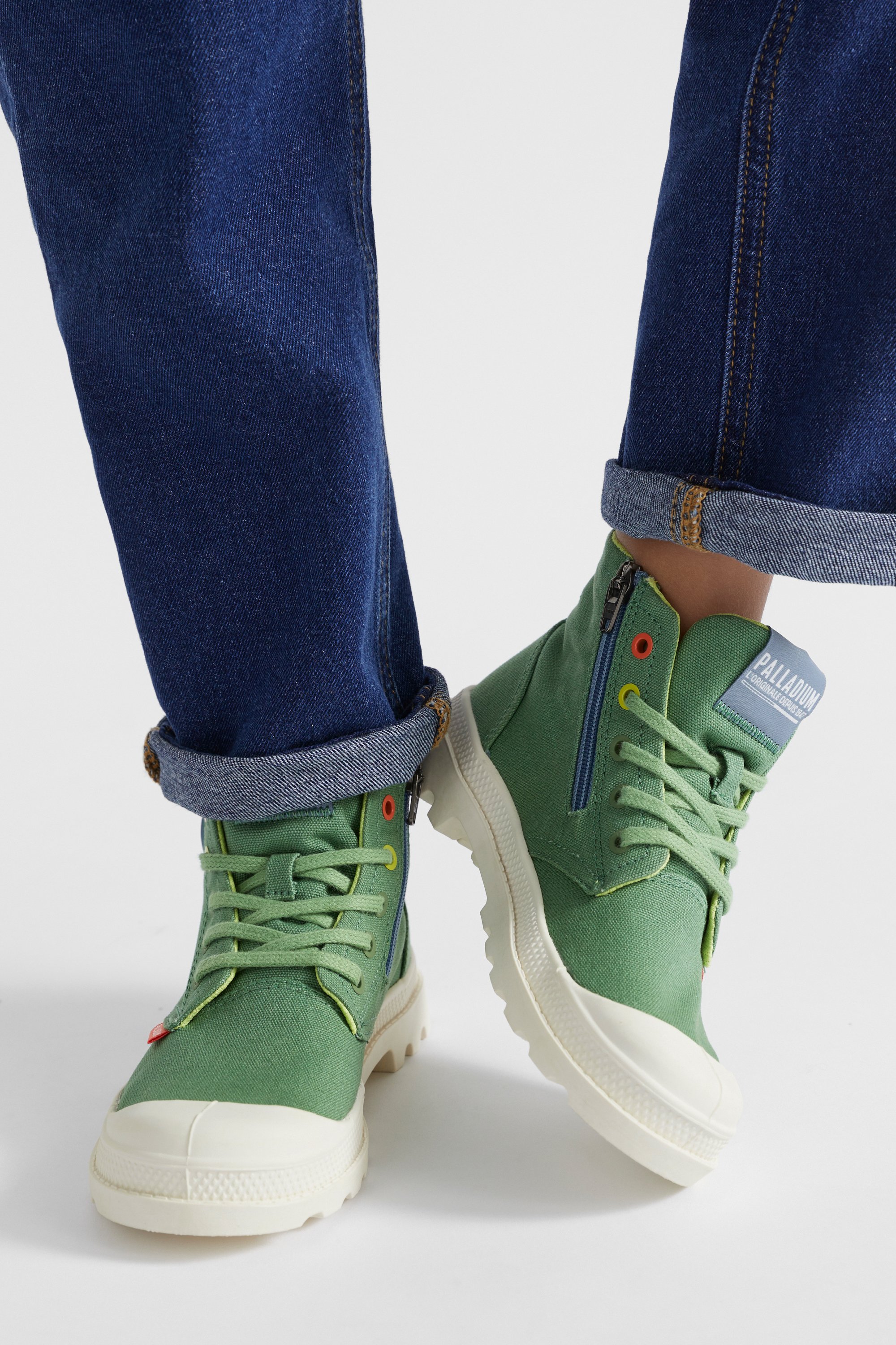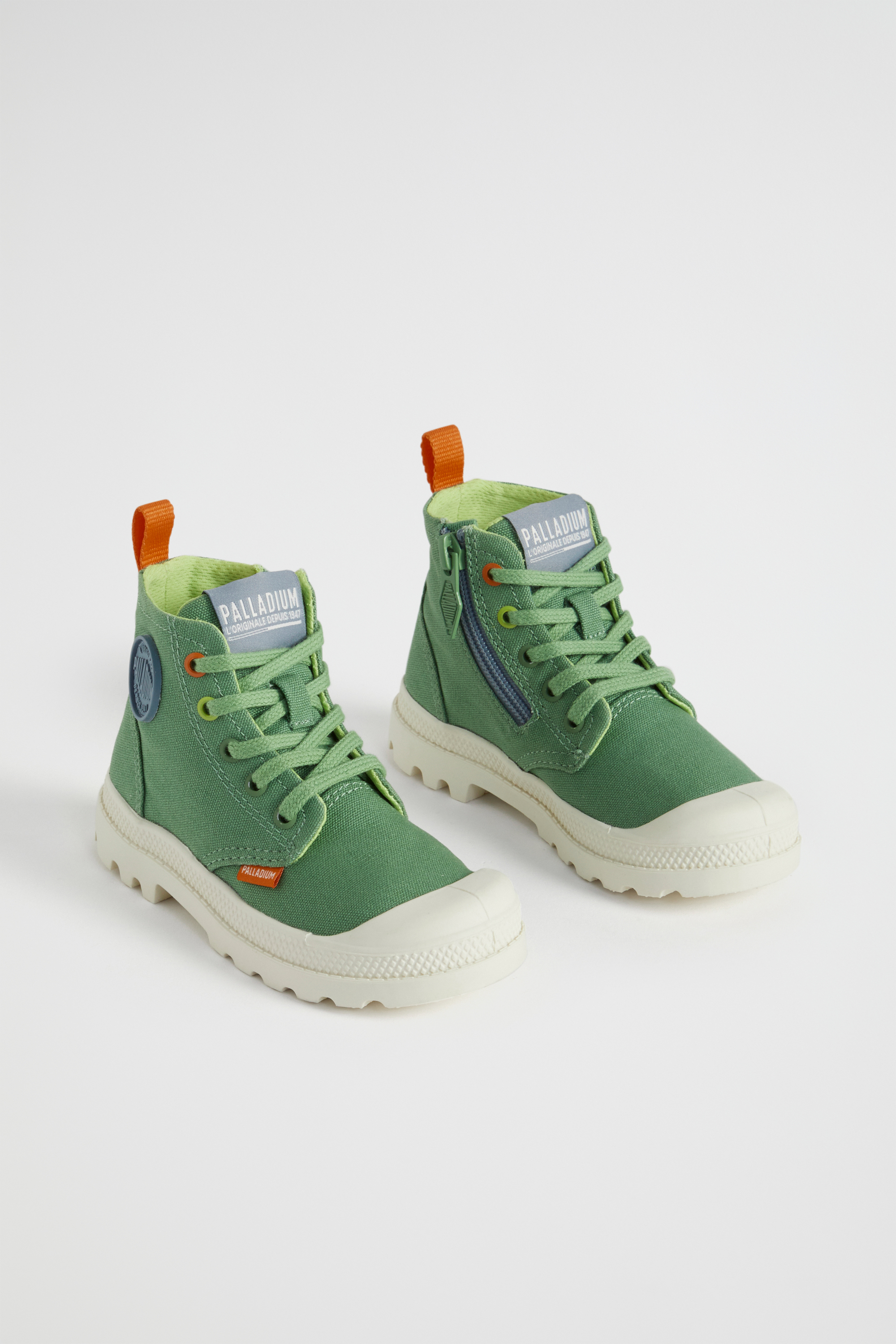 Fun and retro, these Palladium sneakers are an ideal addition to any wardrobe. They are a lace-up style with a lightweight chunky sole, a rubber toecap, a stonewashed canvas upper, and a contrasting zip closure and pull tab.