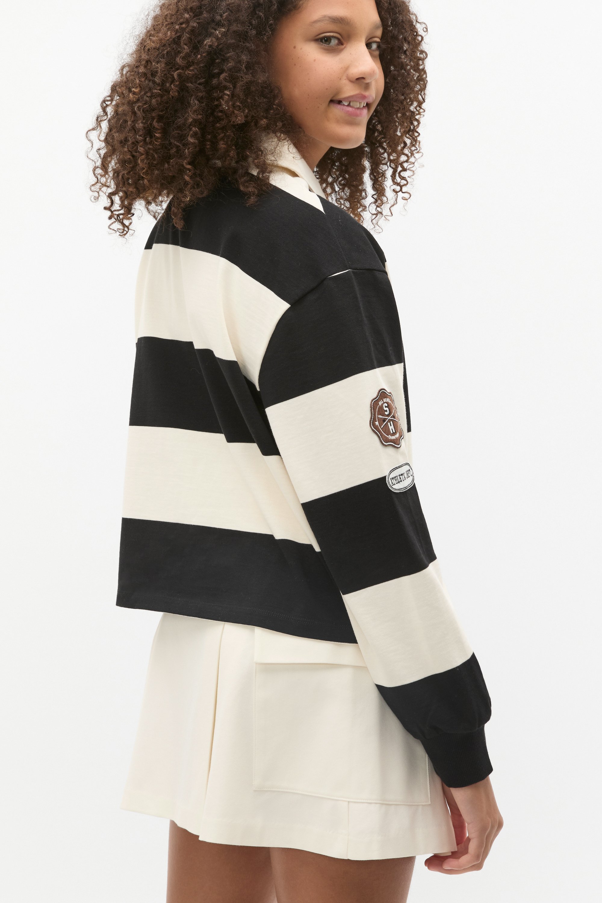 A stylish new take on a classic design, this rugby jumper is an on-trend addition to her wardrobe. It features a collar with a button detail, long sleeves and falls to a cropped length. It's finished in a bold stripe with an embroidered patch on the front.