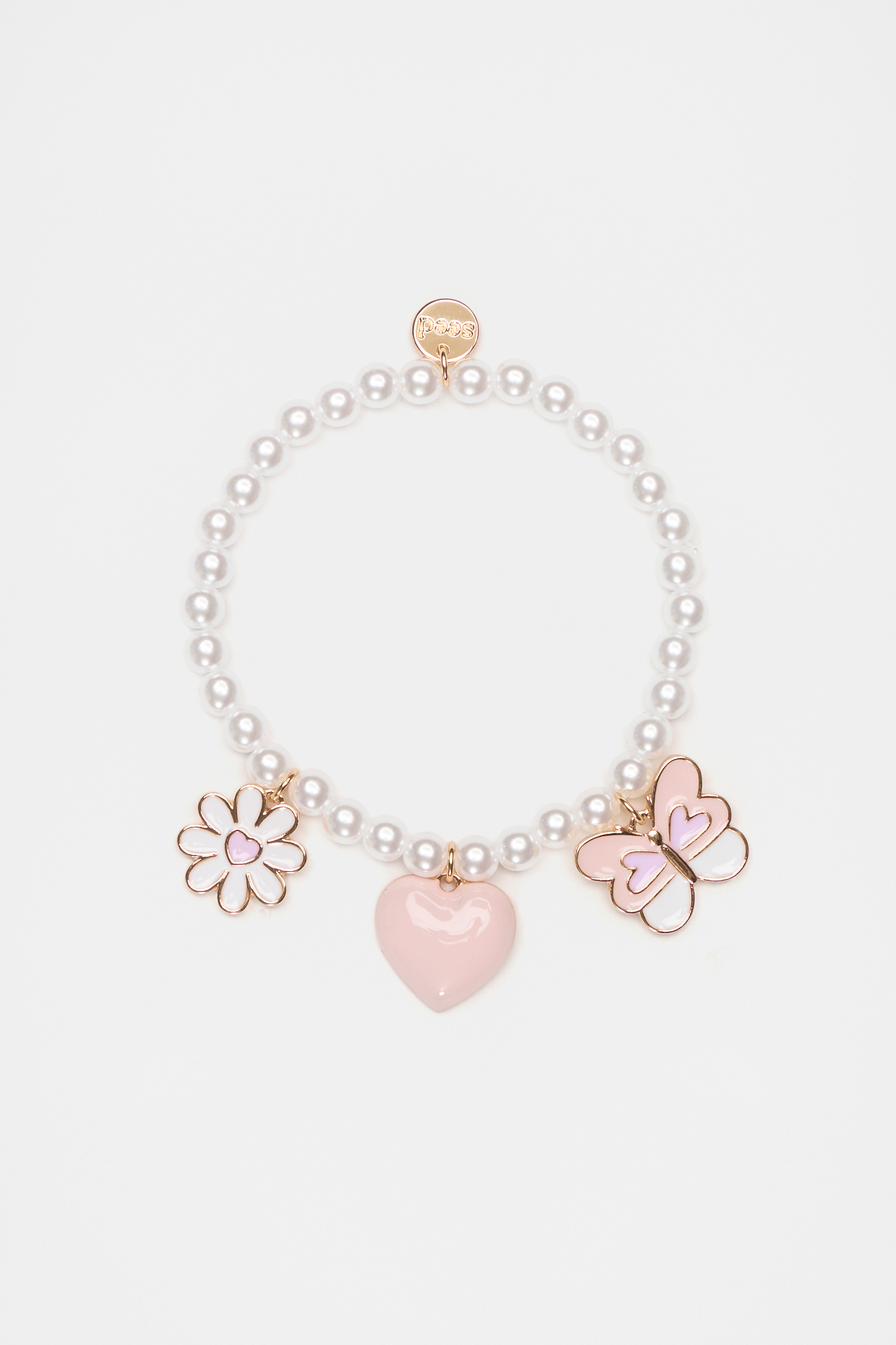 Add a touch of sweetness to her outfit with this charm pearl bracelet. This product is not a toy and is not suitable for children three years and under.