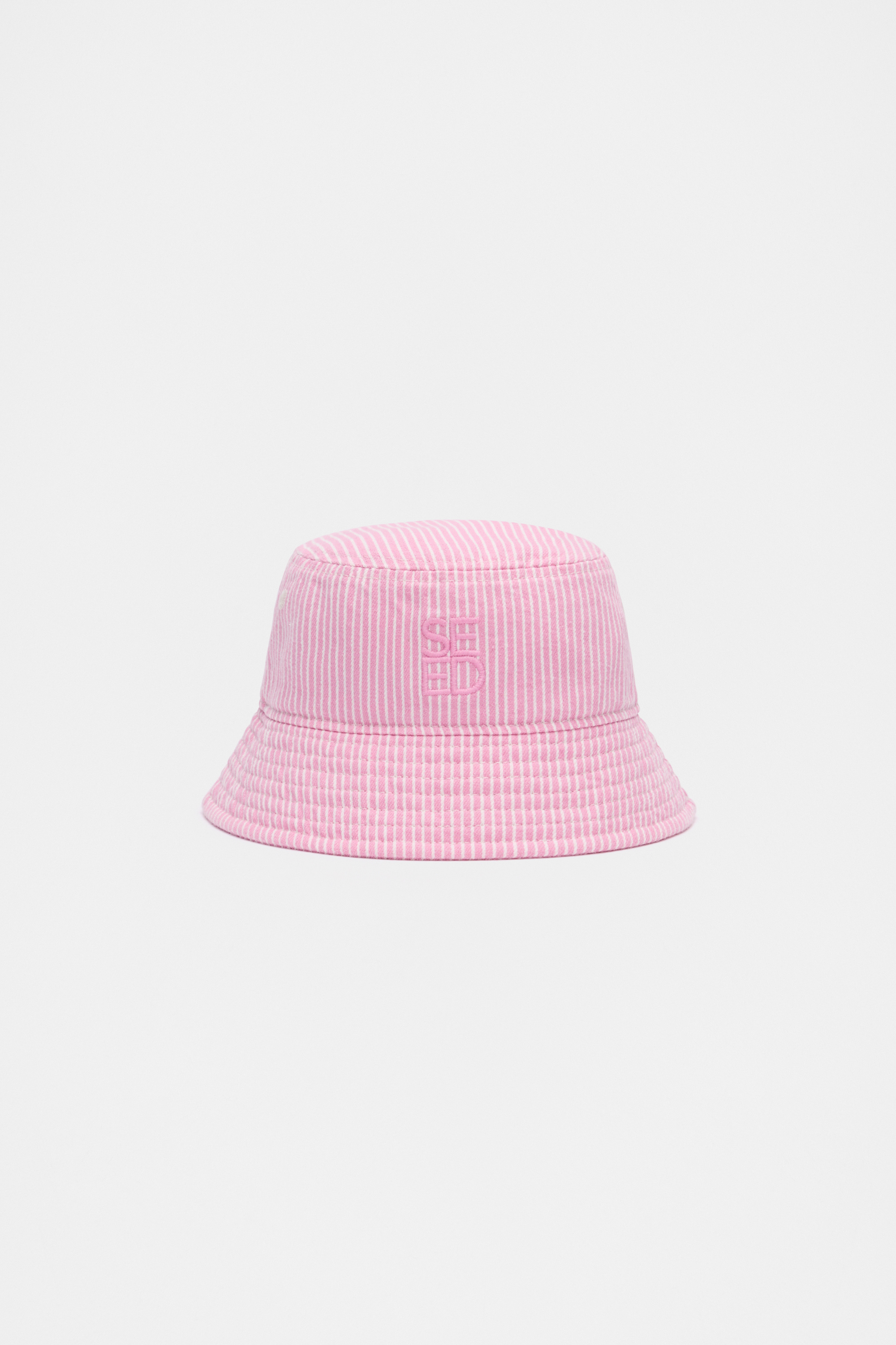 An adorable finishing touch to her outfit, this bucket hat features a stripe design and secures under the chin with a hook-and-loop tie. Crafted in premium cotton.