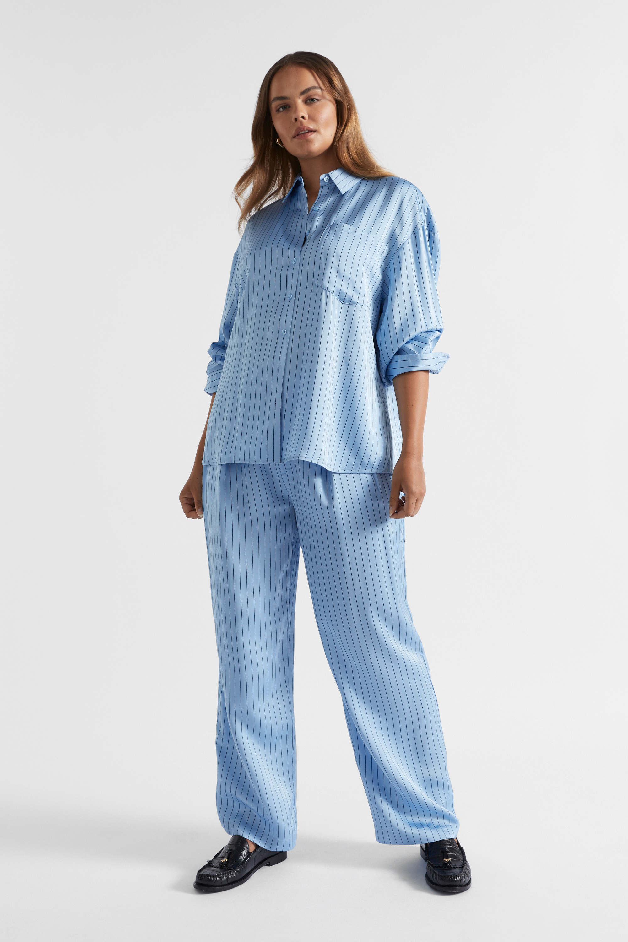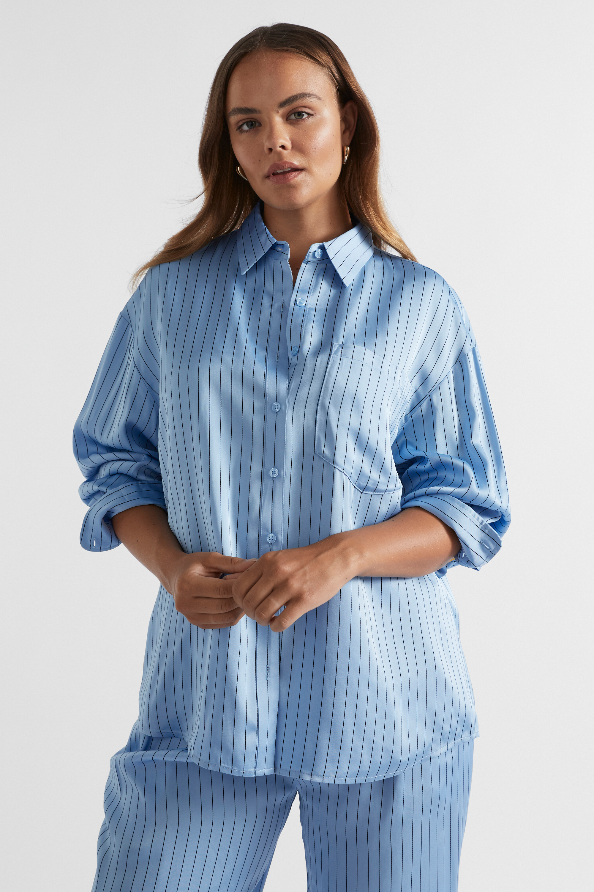 Crafted from a fluid satin, this shirt is a wardrobe staple in a classic pinstripe pattern. It features a front patch pocket, dropped shoulders, long cuffed sleeves, and a curved hem. Wear it with the matching pants for a complete look.