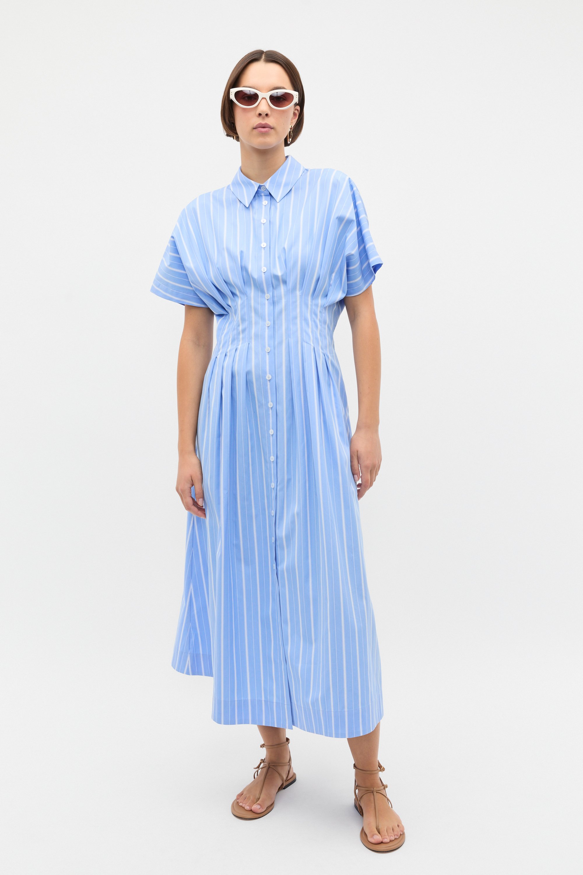 With a crisp, tailored design, this striped dress is a elevated option for your casual wardrobe. Crafted in premium cotton, it features a collar, short sleeves and pleats at the waist to create a feminine silhouette.