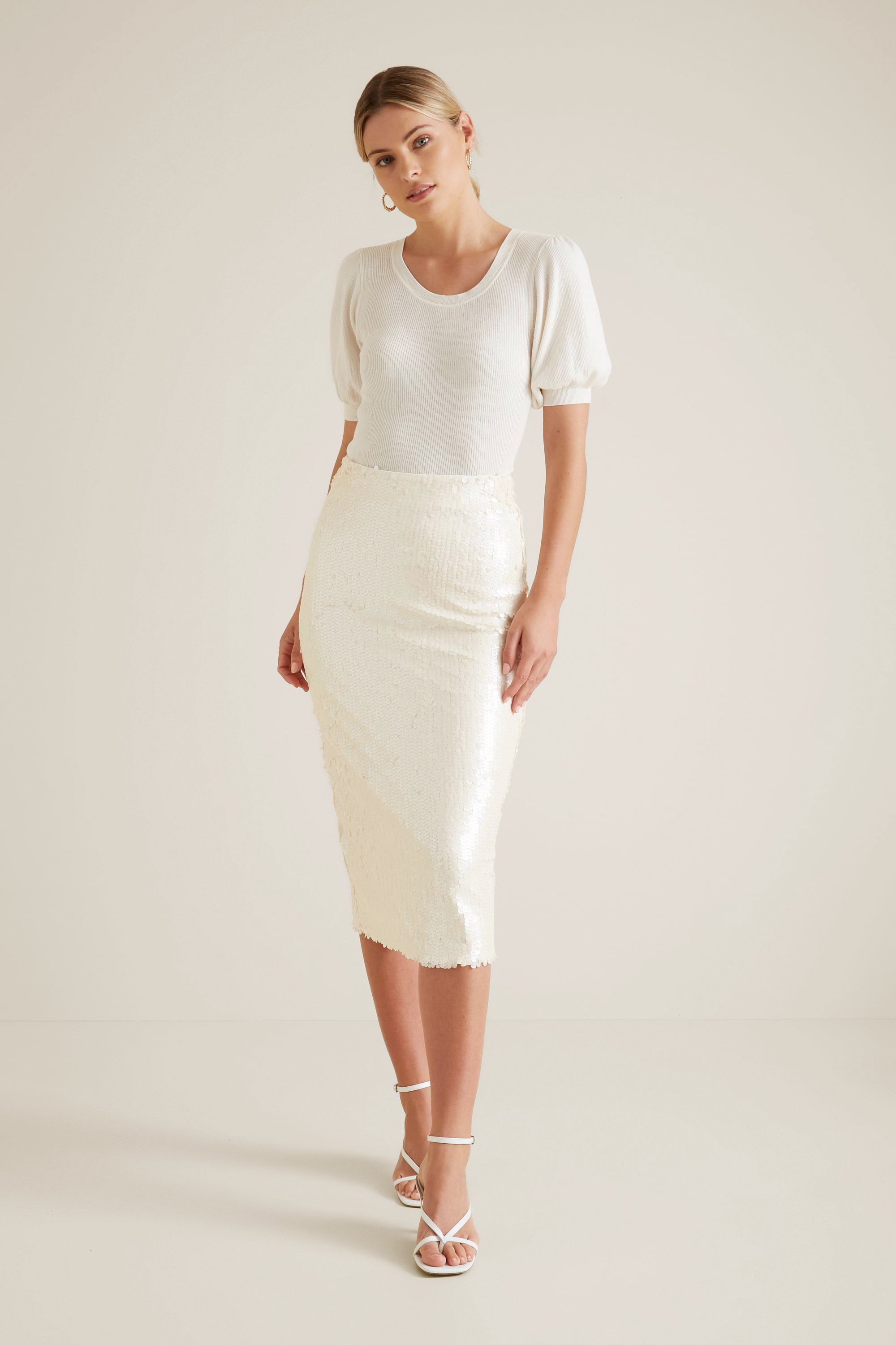 Crafted from a palette-cleansing Cloud Cream, this Puff Sleeve Knit is an officewear essential. Featuring a lightweight ribbed material, this knit is detailed with a crew neckline, puff sleeves and a neat-fitting silhouette. For your reference, our model is 177 cm tall and wears a size XS. Check the label inside of the garment for care instructions.