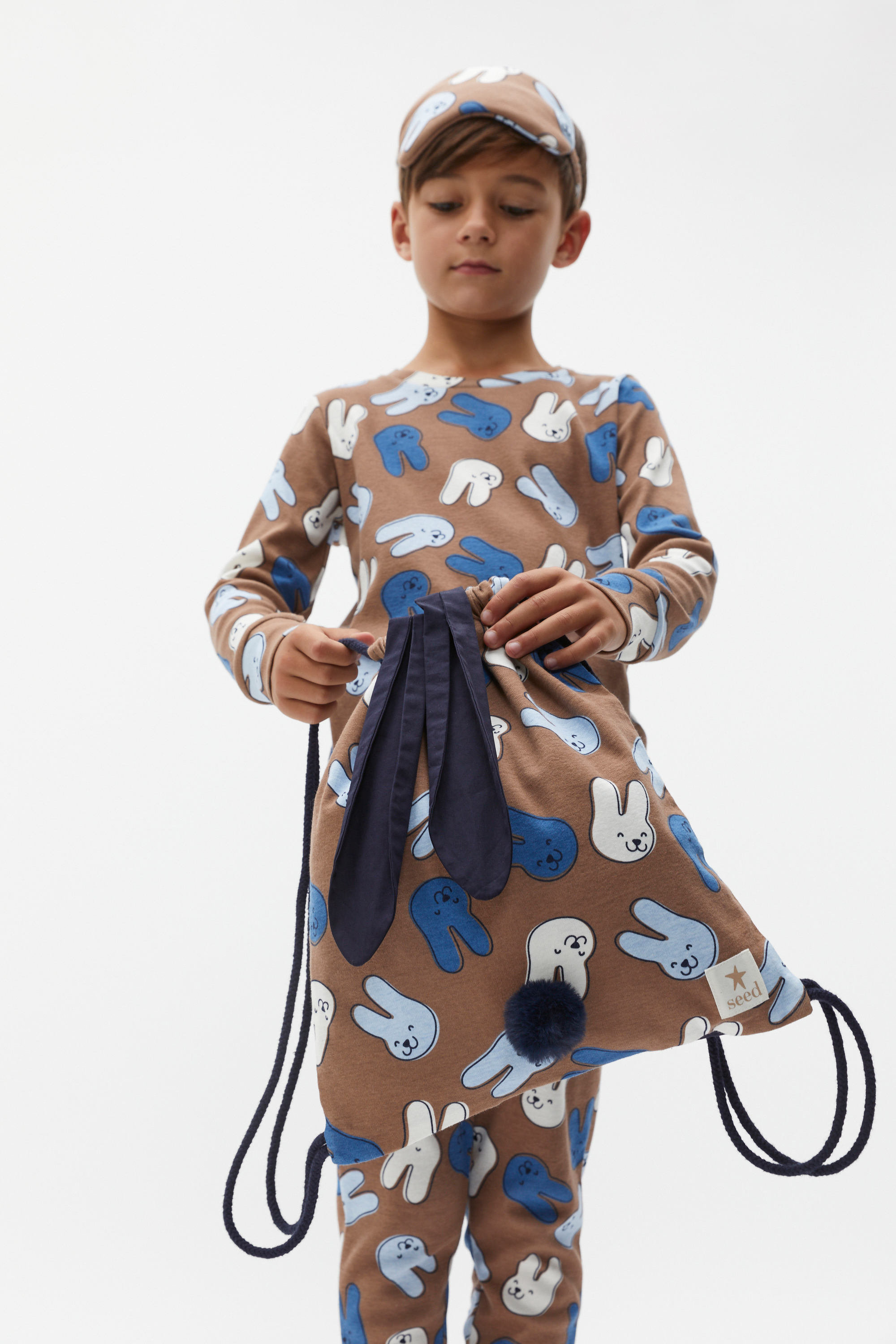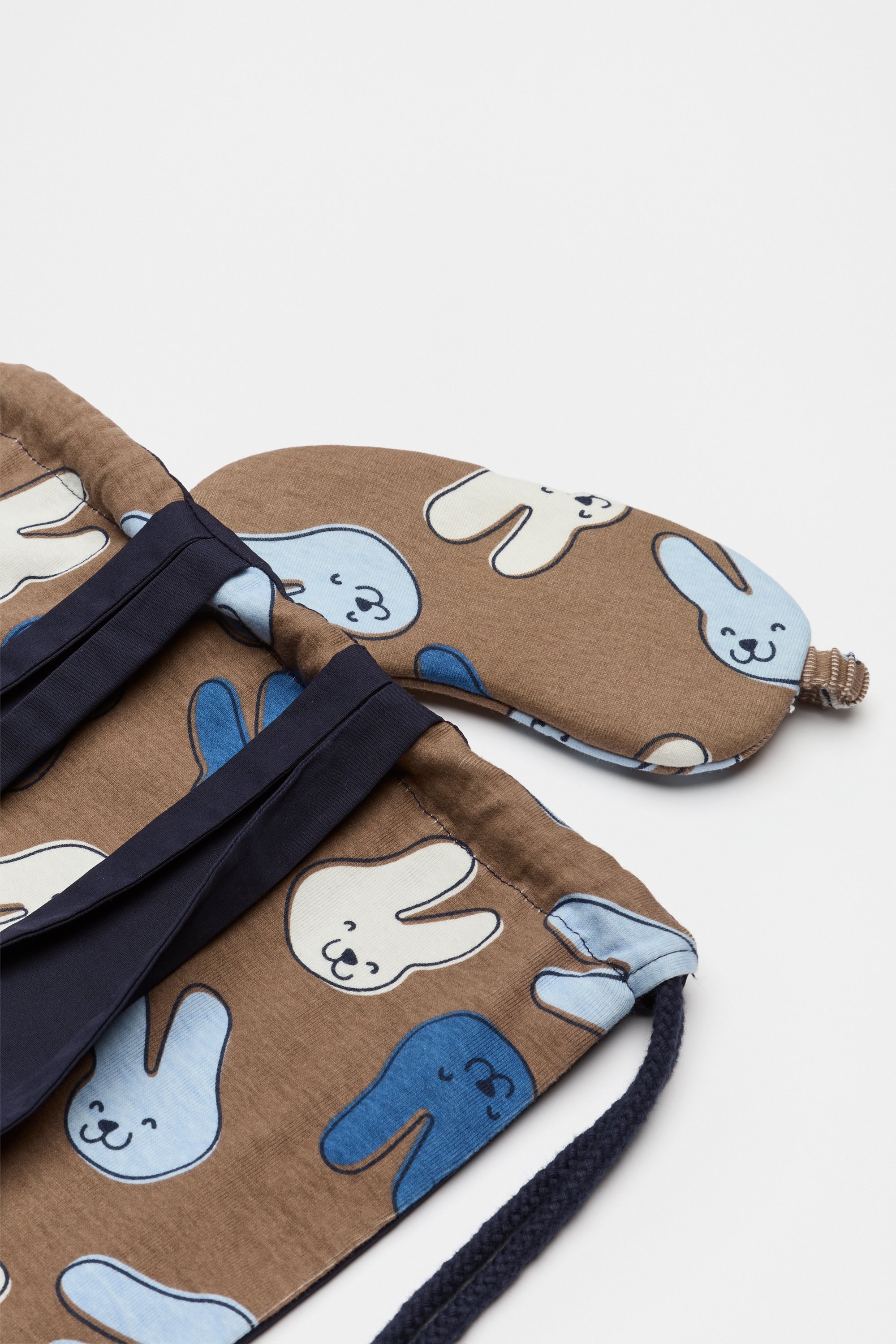 Perfect for sleepovers, this too-cute pyjama bag features a drawstring closure, a fluffy bunny tail, bunny ears and an all over bunny print. Available in three different colourways. Pair with the matching bunny eye mask and matching pyjamas for the perfect overnight set.