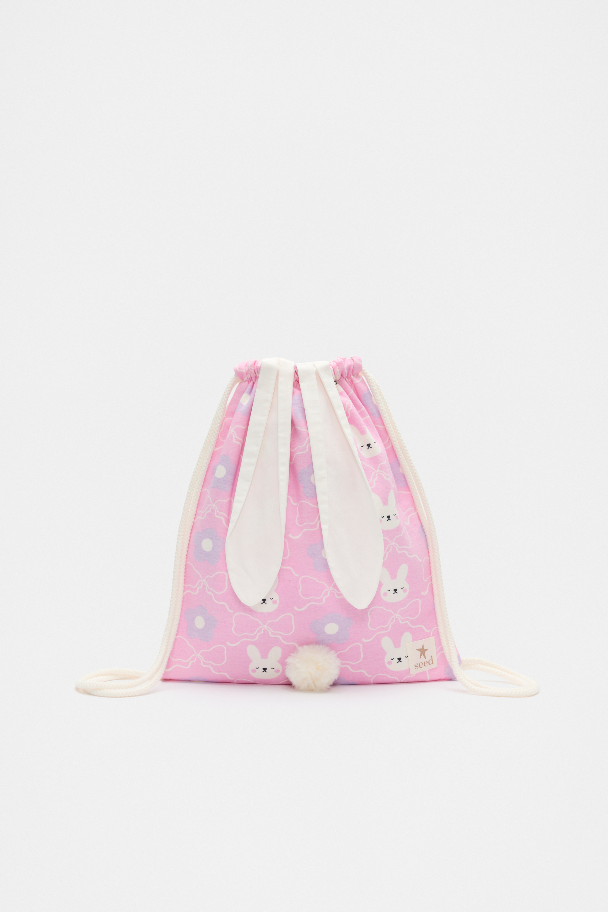 Perfect for sleepovers, this too-cute pyjama bag features a drawstring closure, a fluffy bunny tail, bunny ears and an all over bunny print. Available in three different colourways. Pair with the matching bunny eye mask and matching pyjamas for the perfect overnight set.