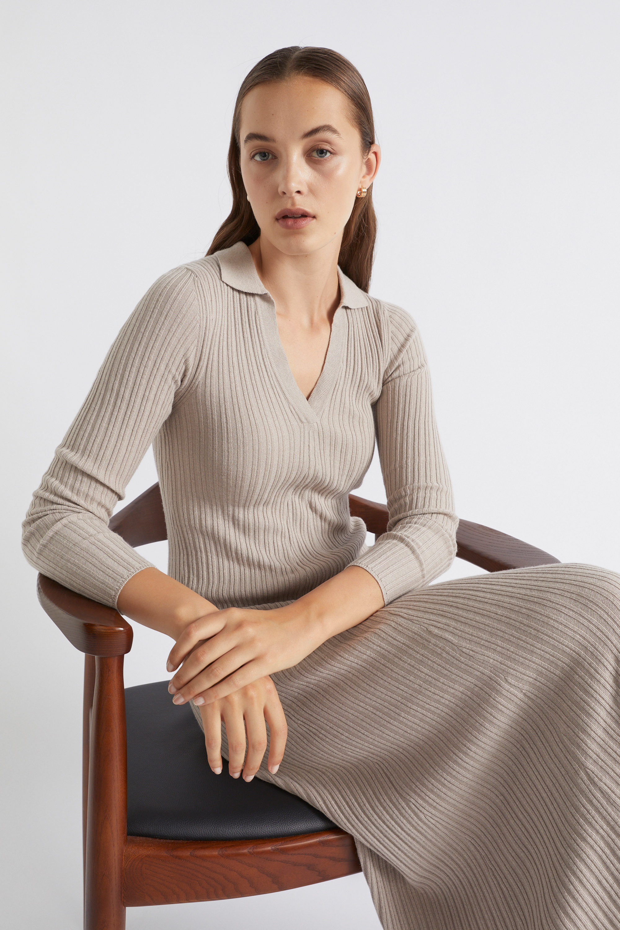 Simple yet striking, this knit dress is sure to be a hit. It features a polo collar and long sleeves, falling in panels to a midi length. The dress is crafted from a stretch blend with cotton and wool.