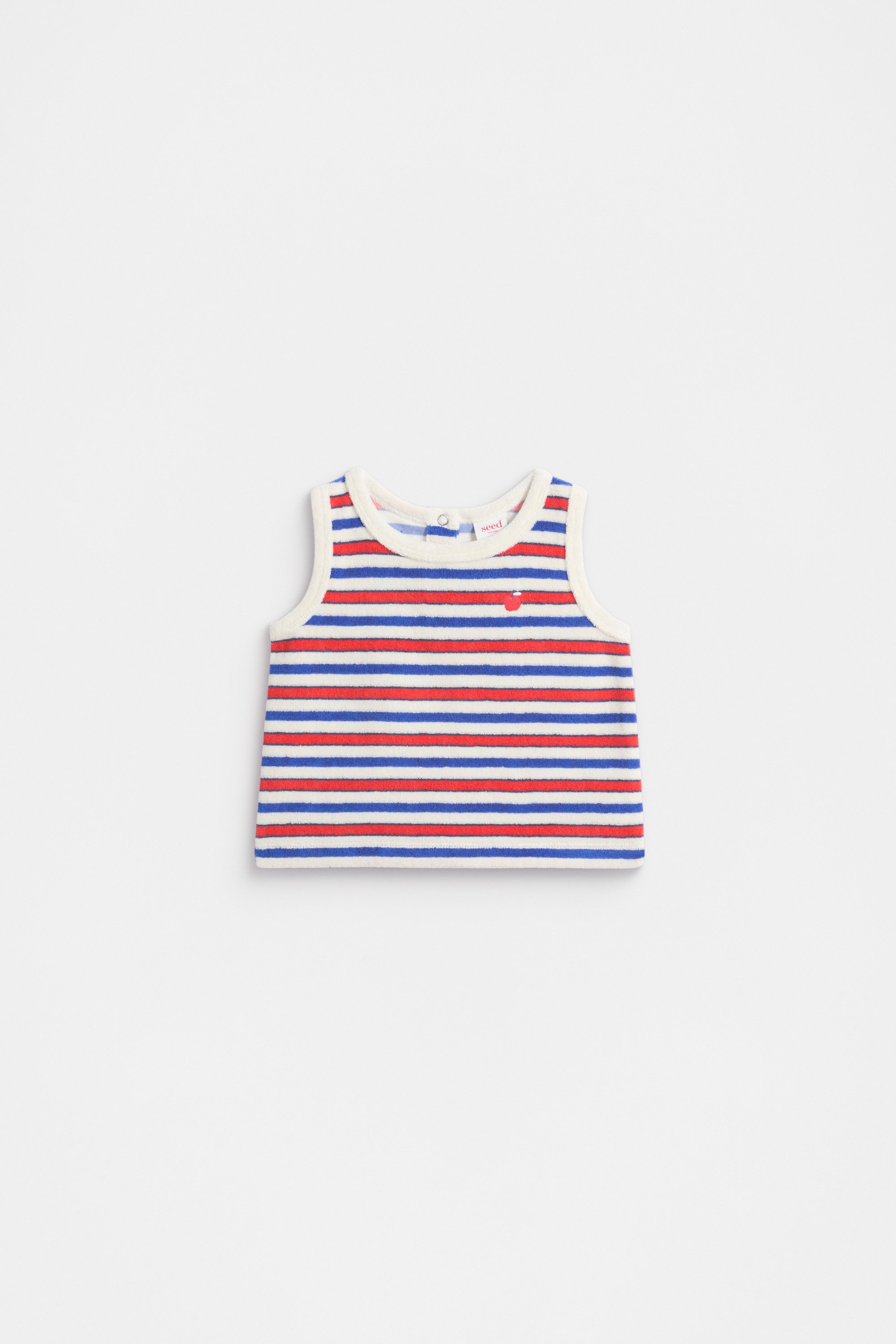 Comfortable, cute and perfect for summer, this toweling tank has a stripe design and a retro feel. Crafted in a premium cotton blend, it's a sleeveless style and features a round neck and an apple patch. It fastens with snaps at the back of the neck. Pair with the matching shorts for the cutest head-to-toe set.