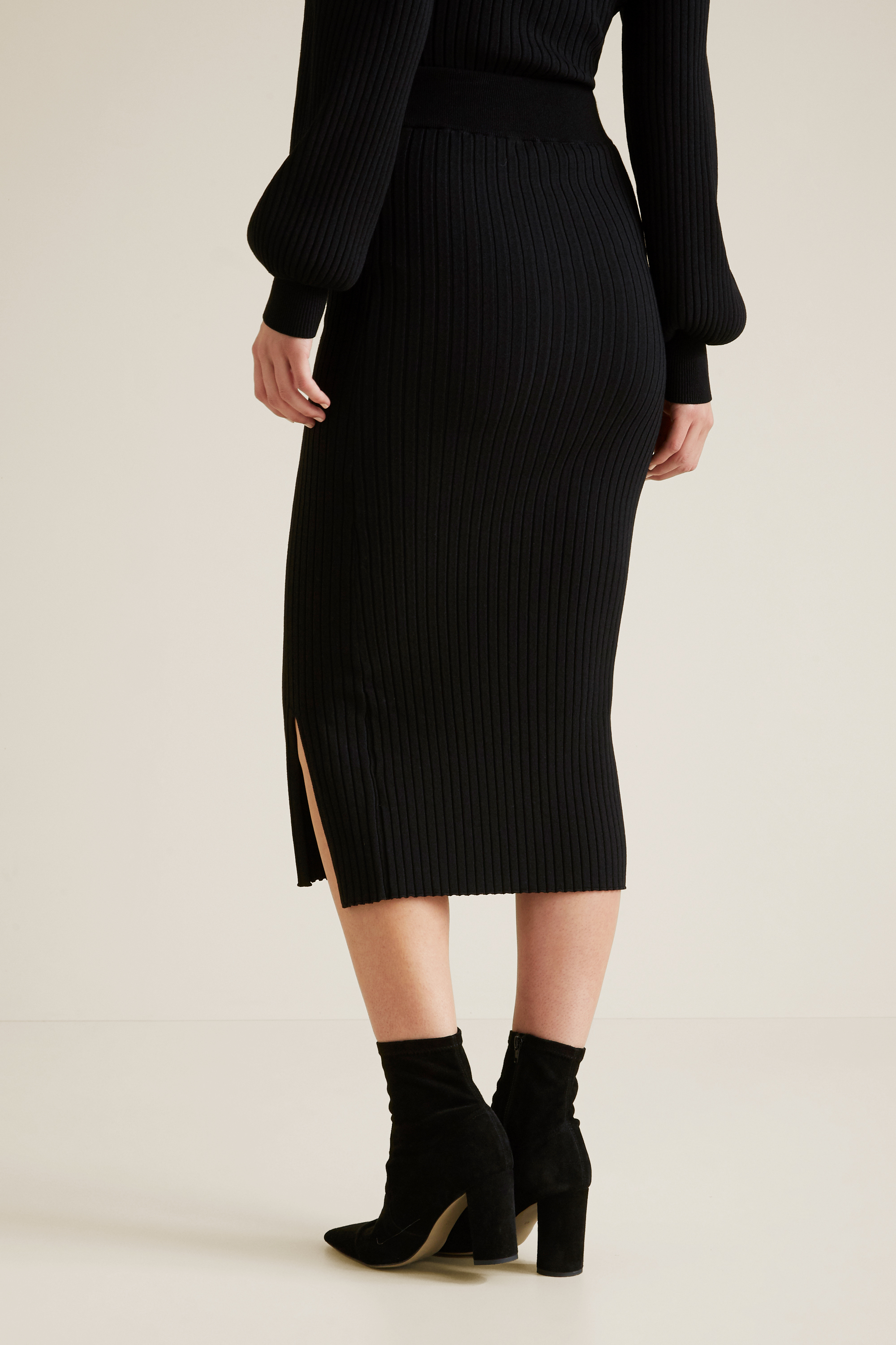 Epitomising modern officewear, this Ribbed Crepe Knit Skirt is designed with a forn-flattering high waist.