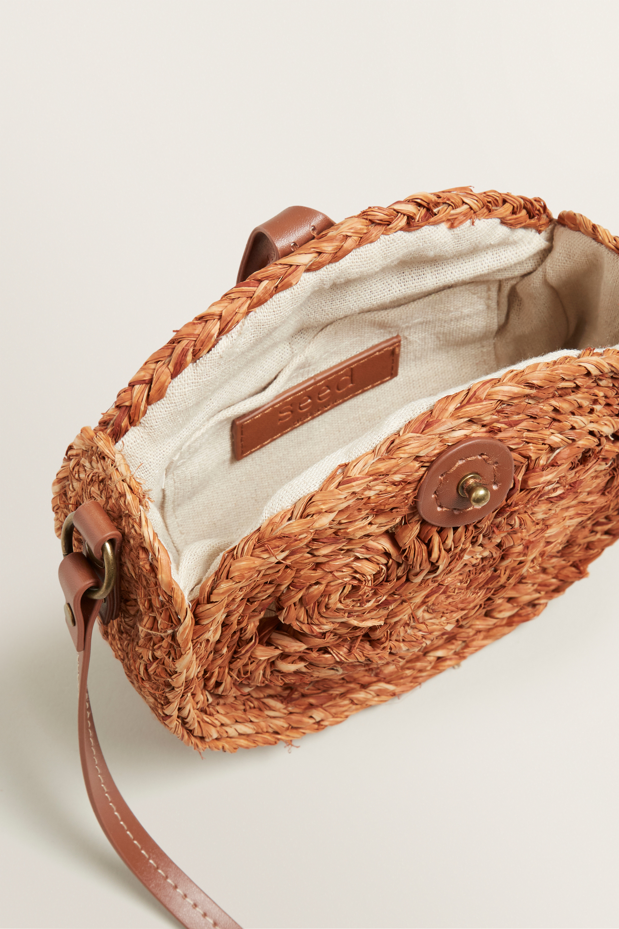 Exude beach-ready styling, with this Round Sling. Featuring a natural woven blend, this sling features a long cross-body strap, lined interior, latch closure and contrast trims.