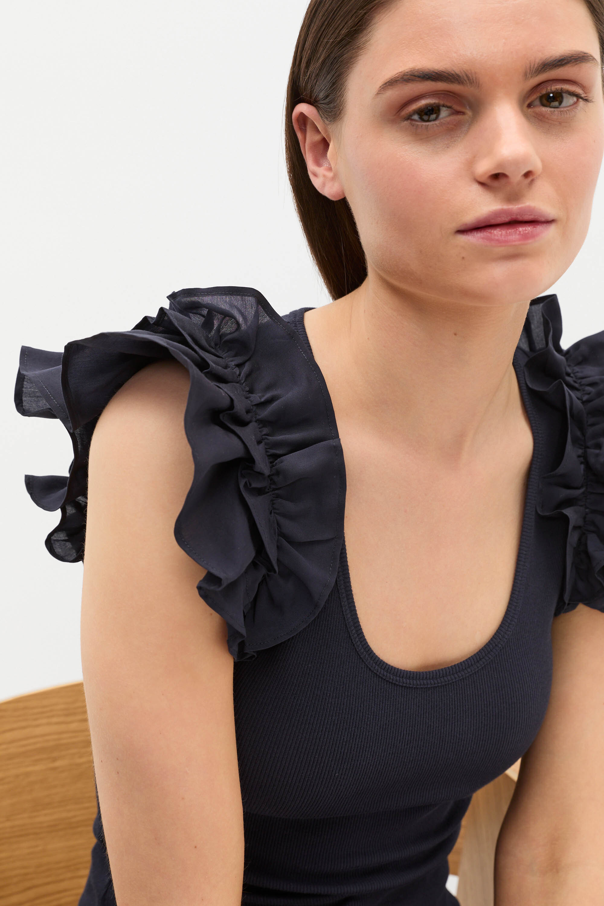 Ready for everyday wear, this tank adds a feminine touch with a ruffle sleeve detail. Crafted in premium cotton, it features a scoop neck and a neat stretch fit through the body. By choosing our cotton products you're supporting our investment in Better Cotton's mission. This product was sourced via a system of mass balance and therefore may not contain Better Cotton.