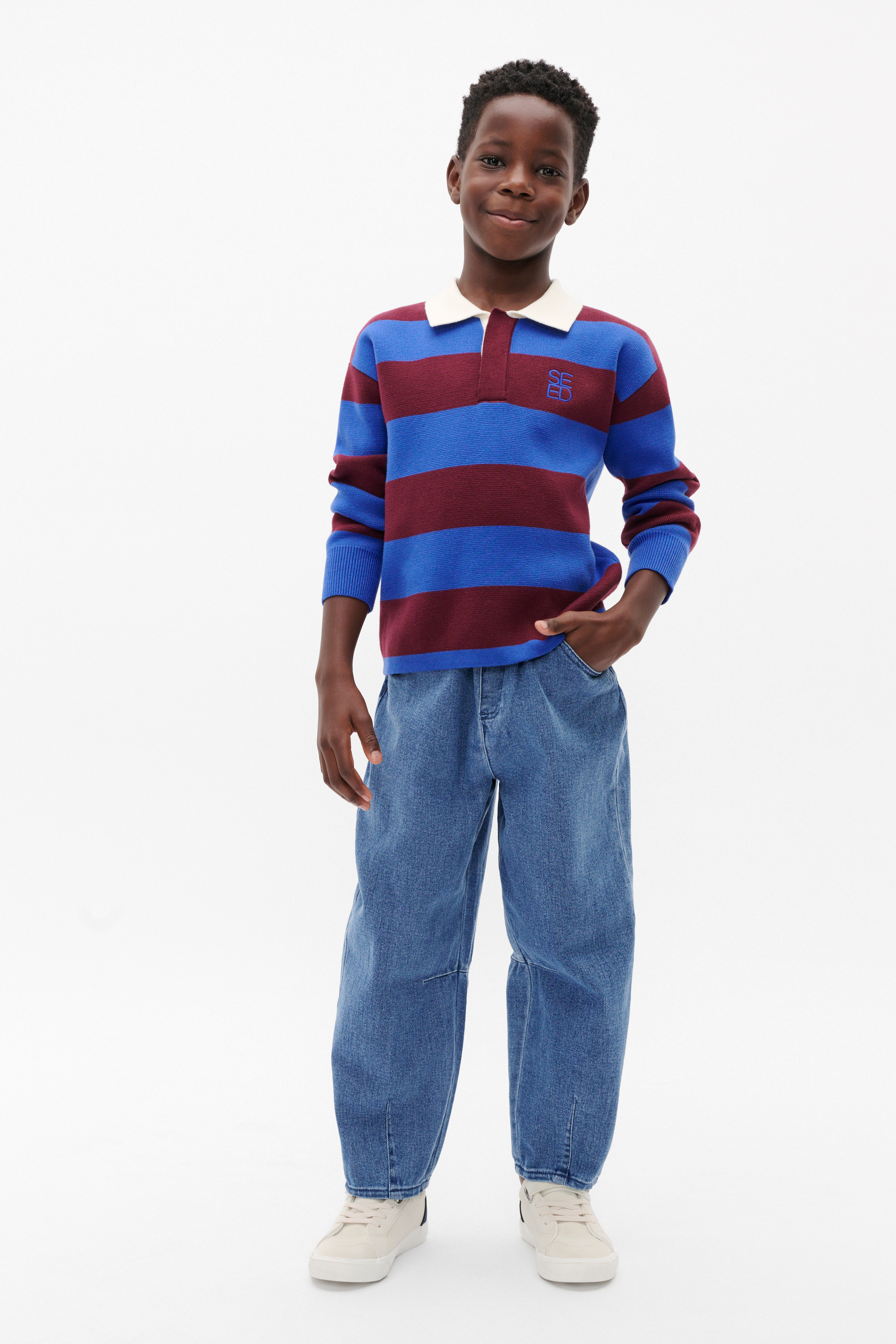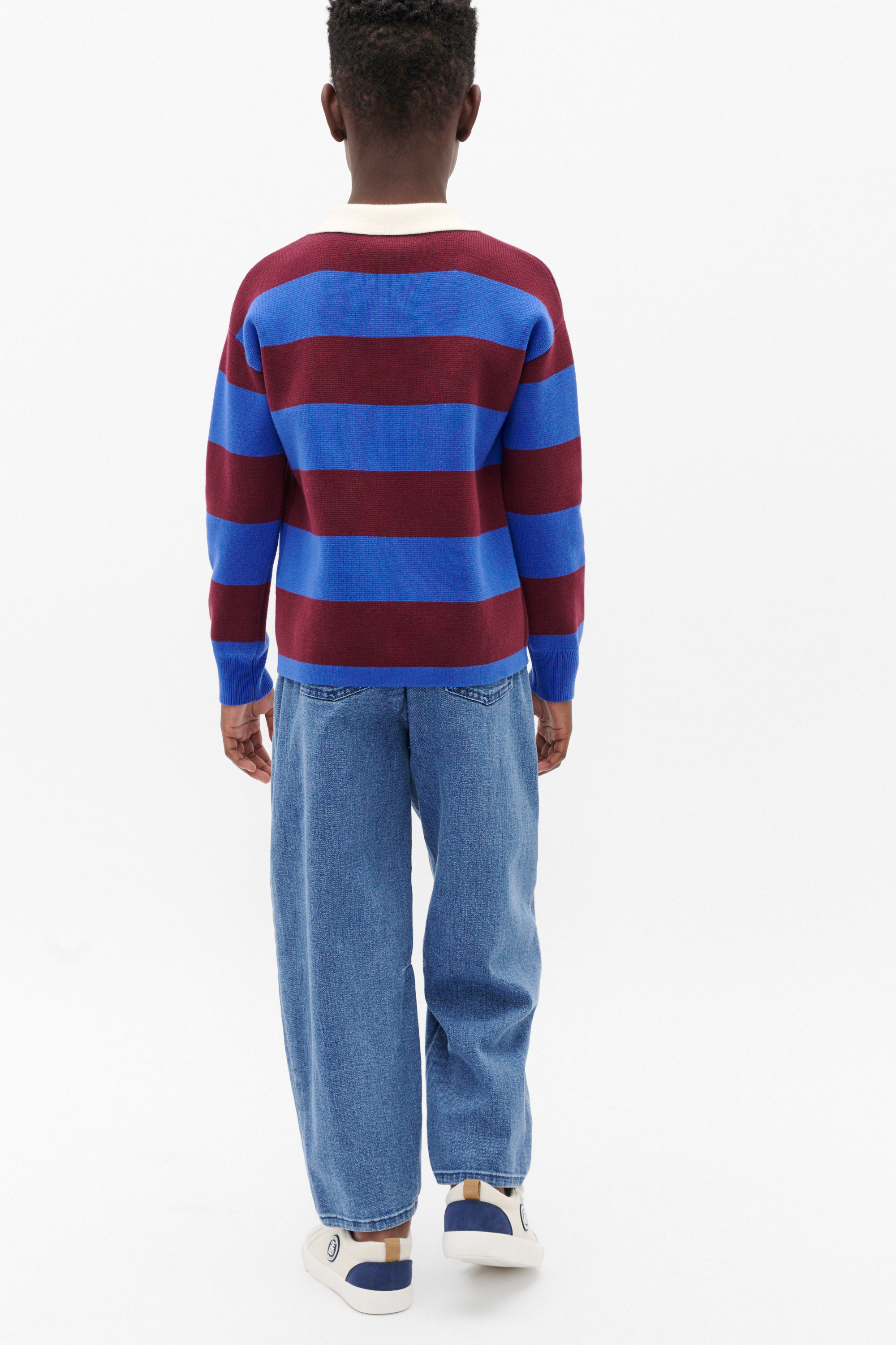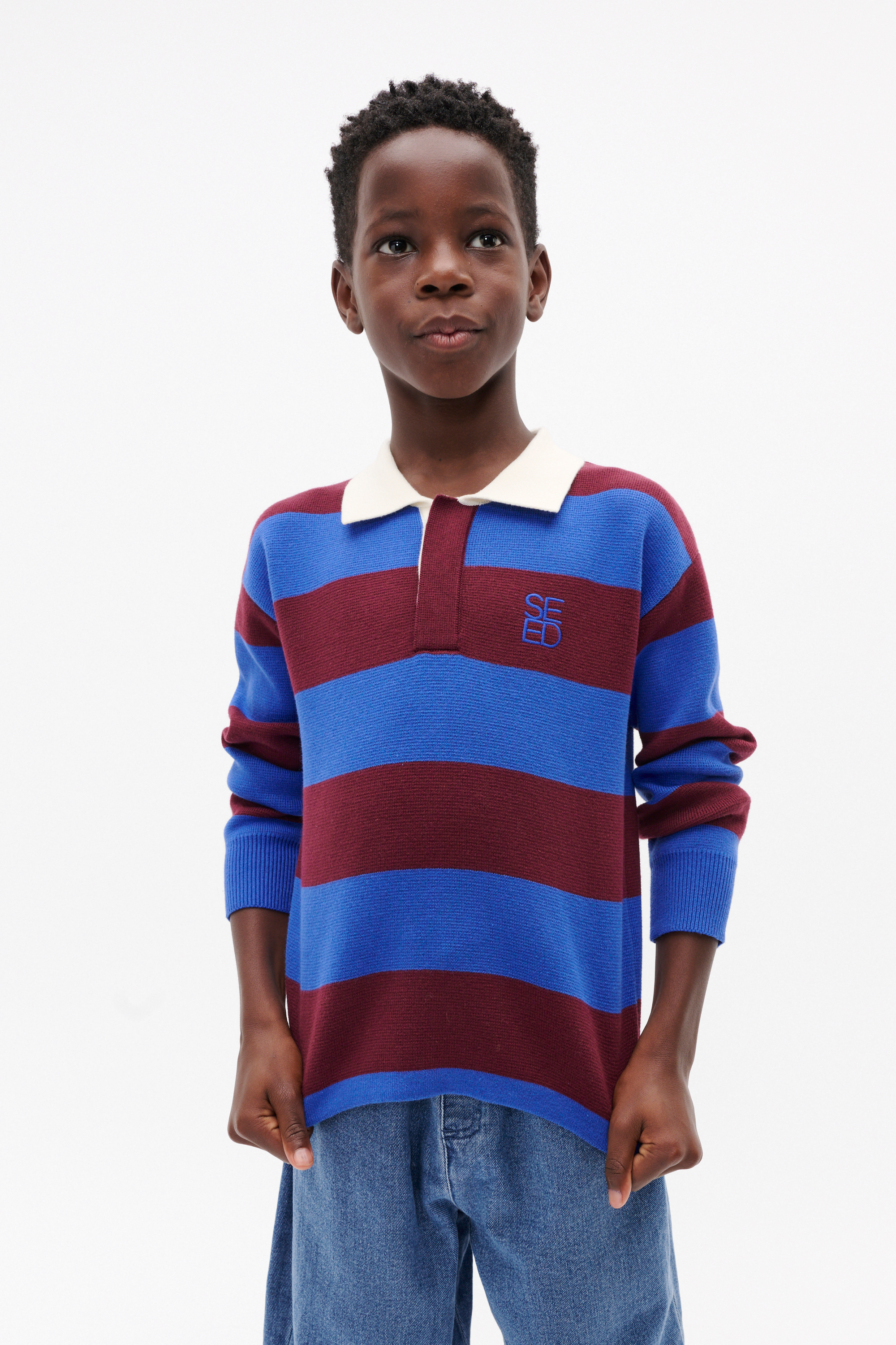 Trendy and cool, this rugby sweater is a handy layer for his transeasonal wardrobe. It features a contrast collar, long sleeves, a bold stripe design and has a little stretch.