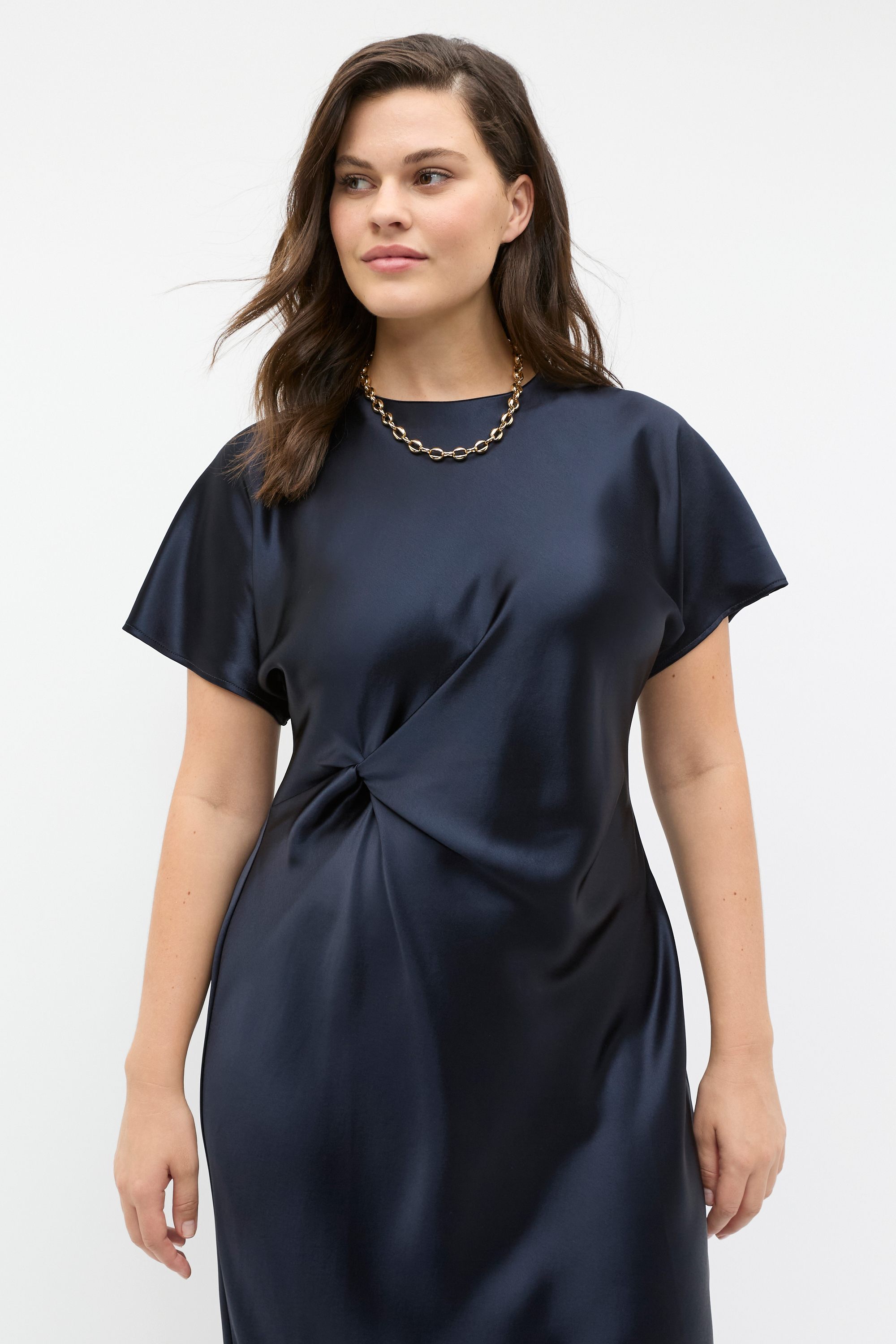 Add effortless elegance to your evening wardrobe with this sleek and simple satin dress. With a smooth luxe finish, it features a round neck, kimono sleeves and a subtle fit and flare design through the body. It has a knotted detail at the waist offering a shaped silhouette and secures at the rear with an invisible zip.