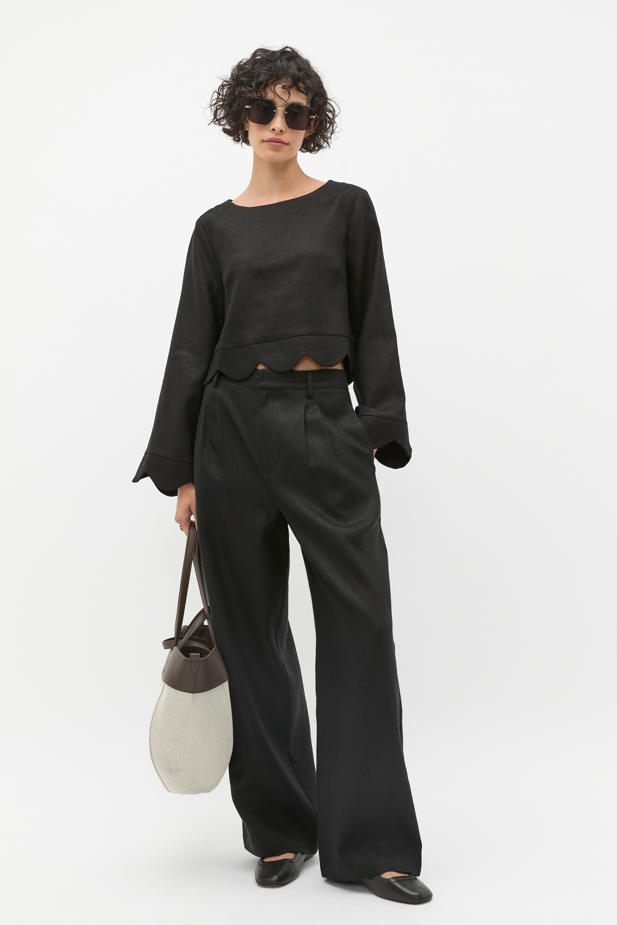 A simple design for effortless sophistication, this top features a round neck, long sleeves and is finished with a scallop trim. Crafted in a premium, heavier weight linen, it's ideal for the changing seasons. It secures with a zip at the back of the neck.