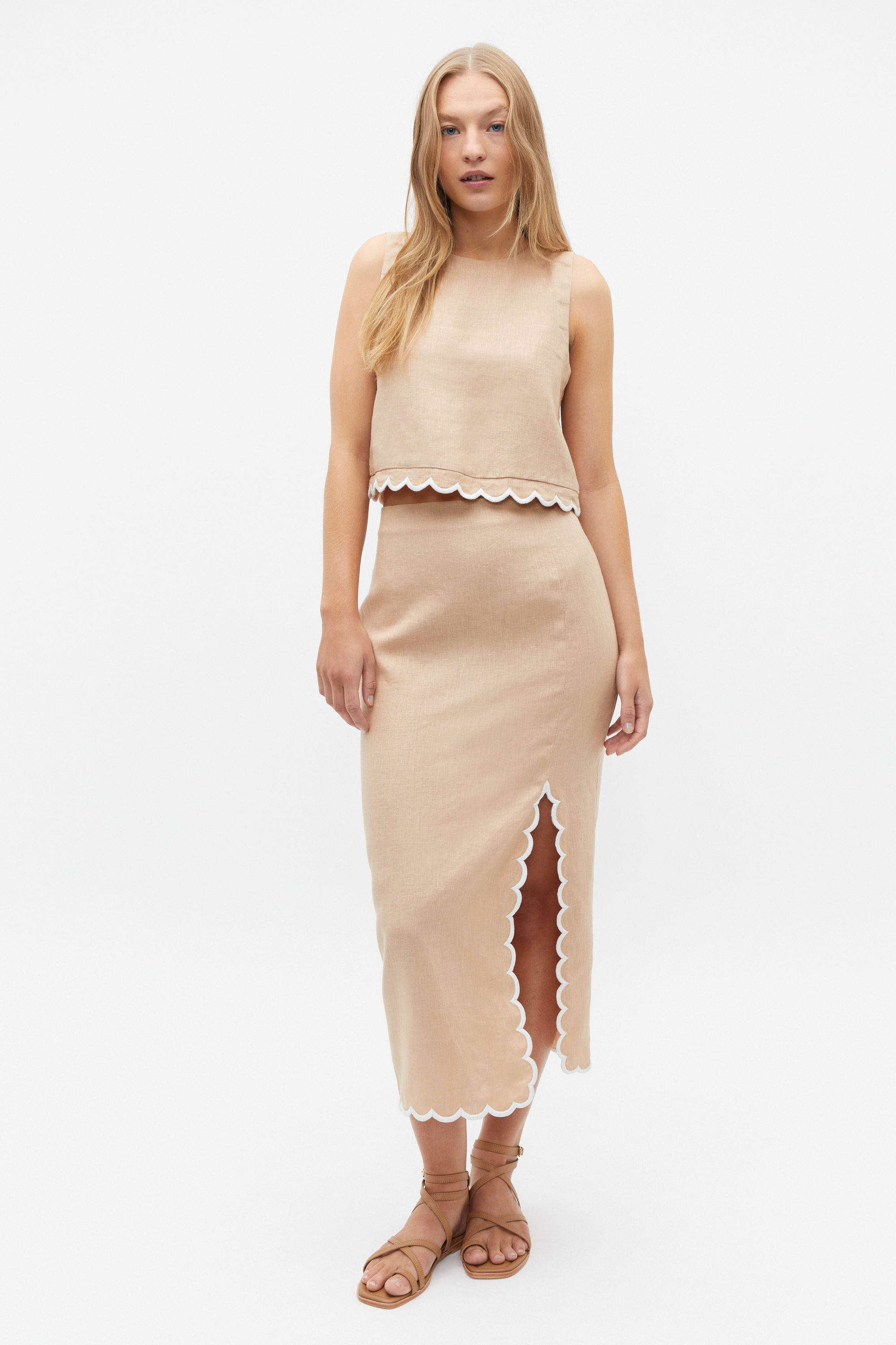 With a scallop trim for added interest, this linen skirt is set to be your new favourite styling piece, lightweight for the warmer months. It features a straight shape, a front split for movement and secures with a zip at the back. Pair with the matching top for a chic, coordinated look.