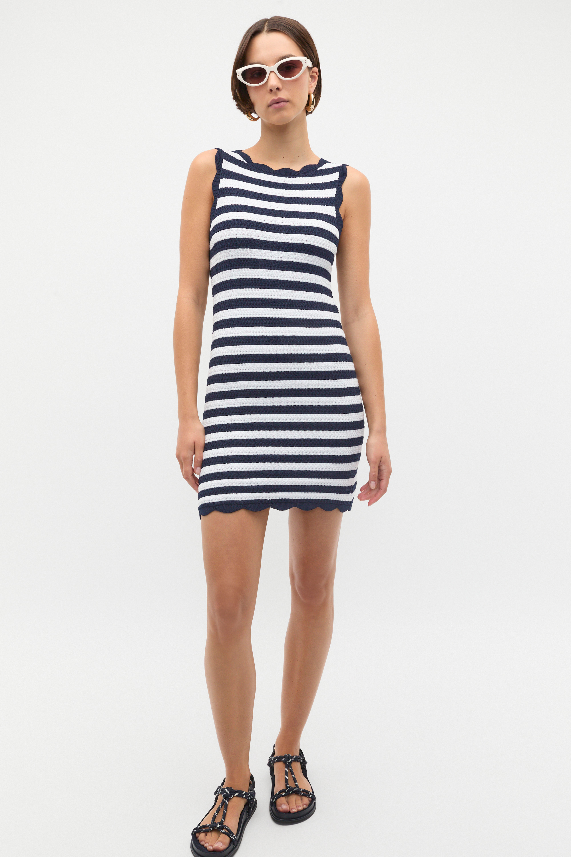 A chic and casual style, this mini is perfect for summer. Crafted in a stretch cotton blend with a knit finish, it features a round neck with a scallop trim detail and a timeless stripe design.