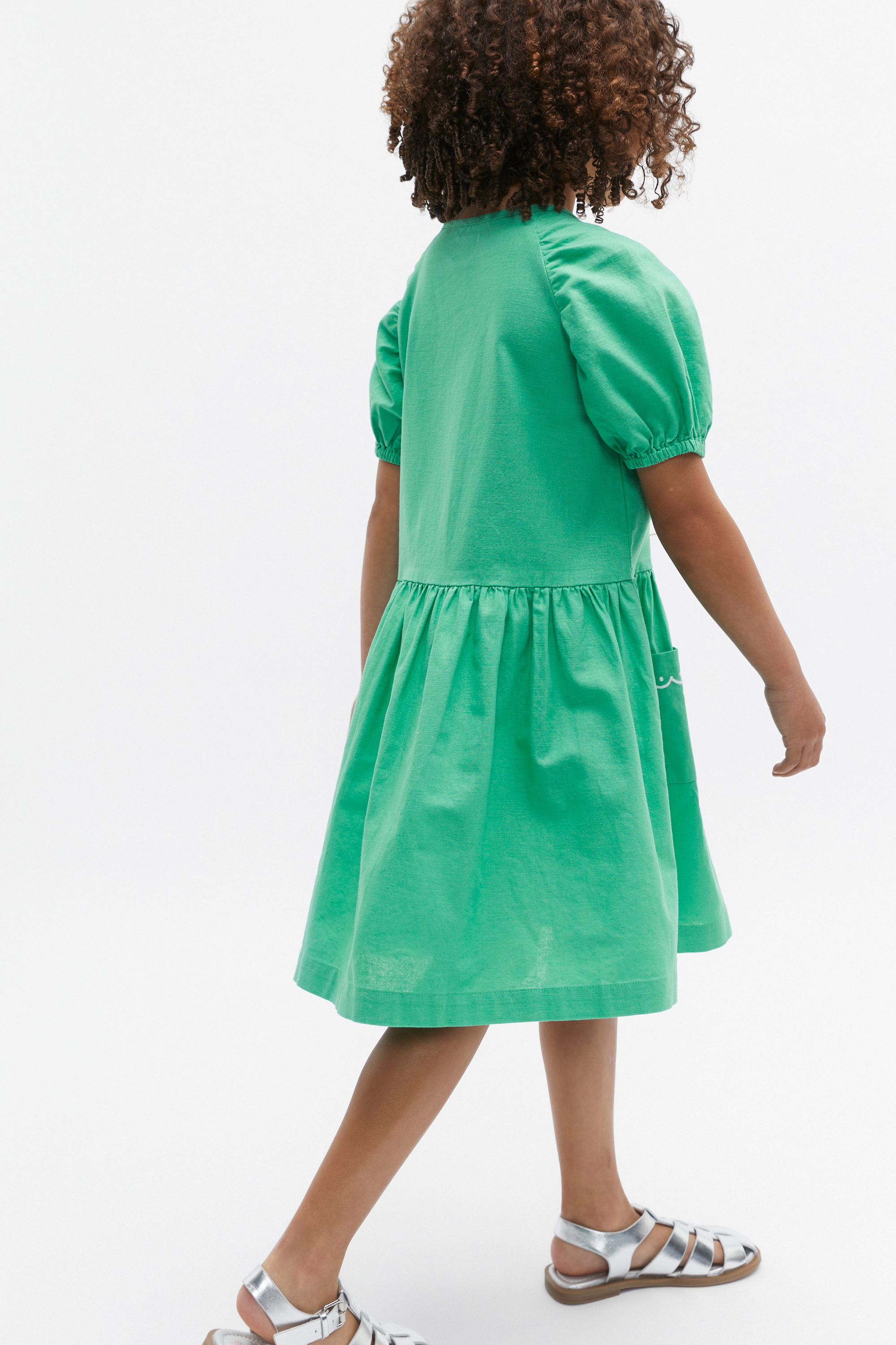 An effortlessly sweet option for her, this dress features a round neck, puff sleeves, front pockets and a scallop trim for added effect.