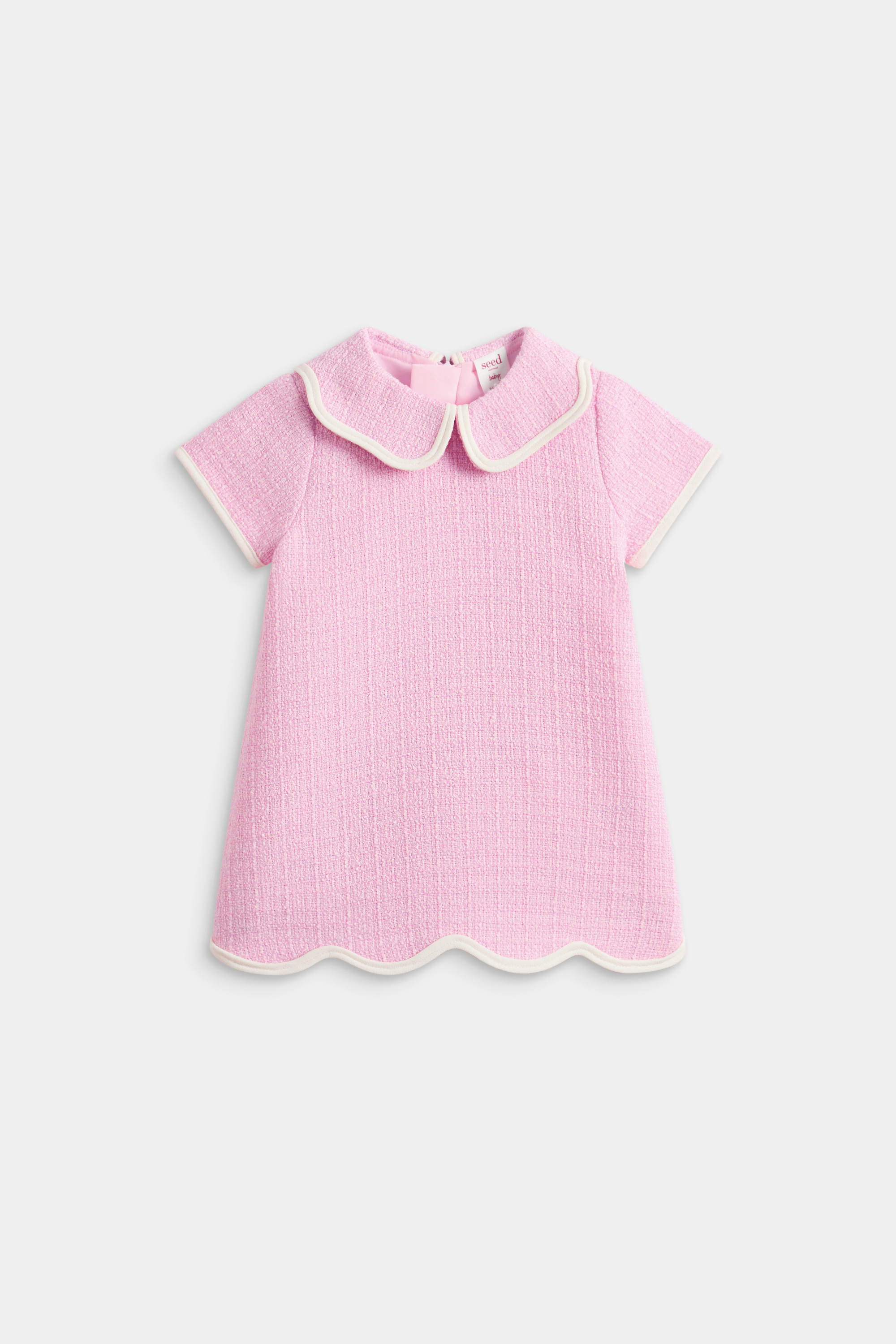 Adorably finished with the scallop trim details, this dress is the sweetest style for her special occasions. Head-to-toe in textured tweed, it features a scallop trim collar, short sleeves and a scallop trim hem. Secures with a zip at the back of the neck.