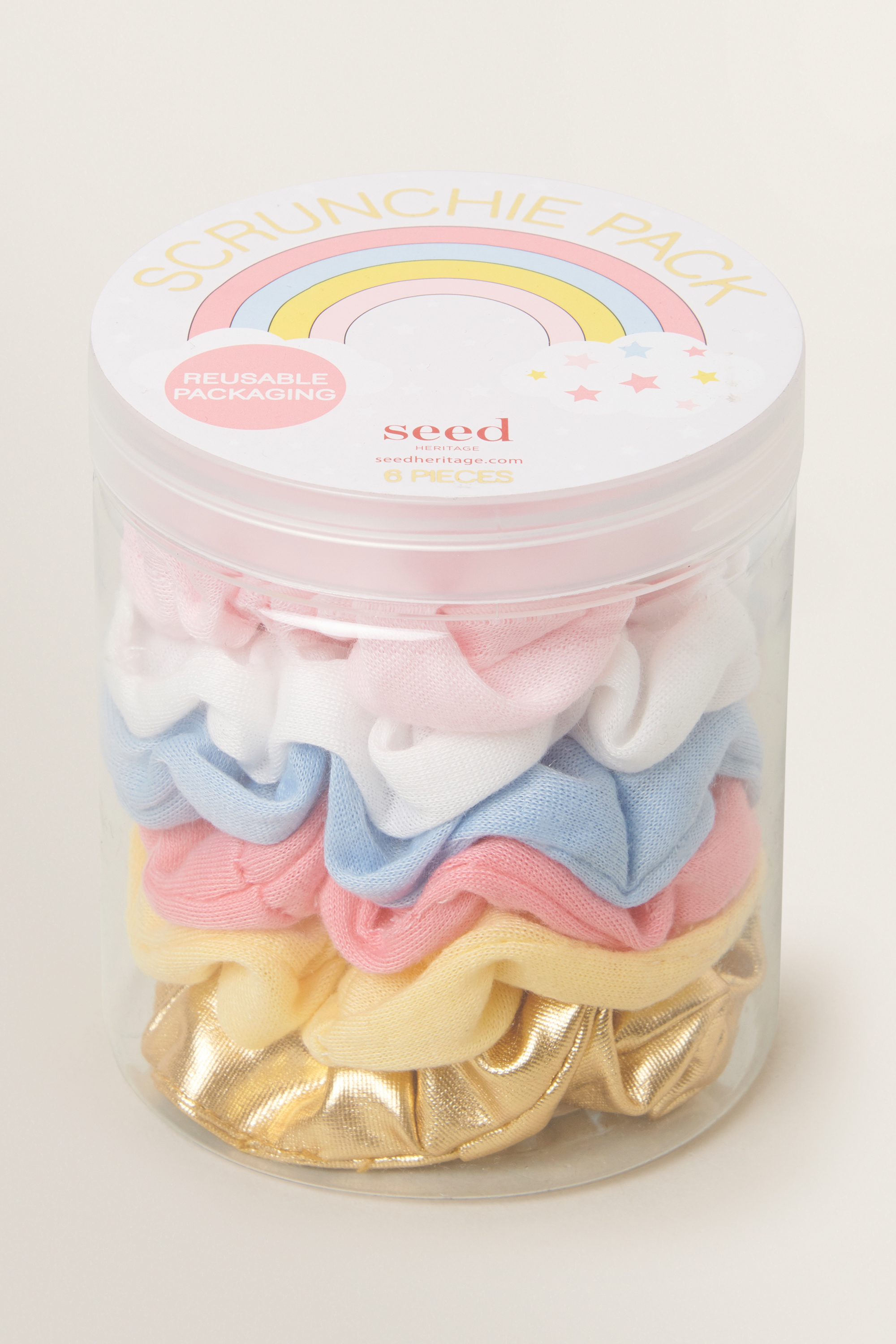 This Scrunchie Pack features a set of five hair ties to mix-and-match. Featuring a bold fabric exterior and super-stretchy base, these hair ties are neatly packaged in a reusable case.
