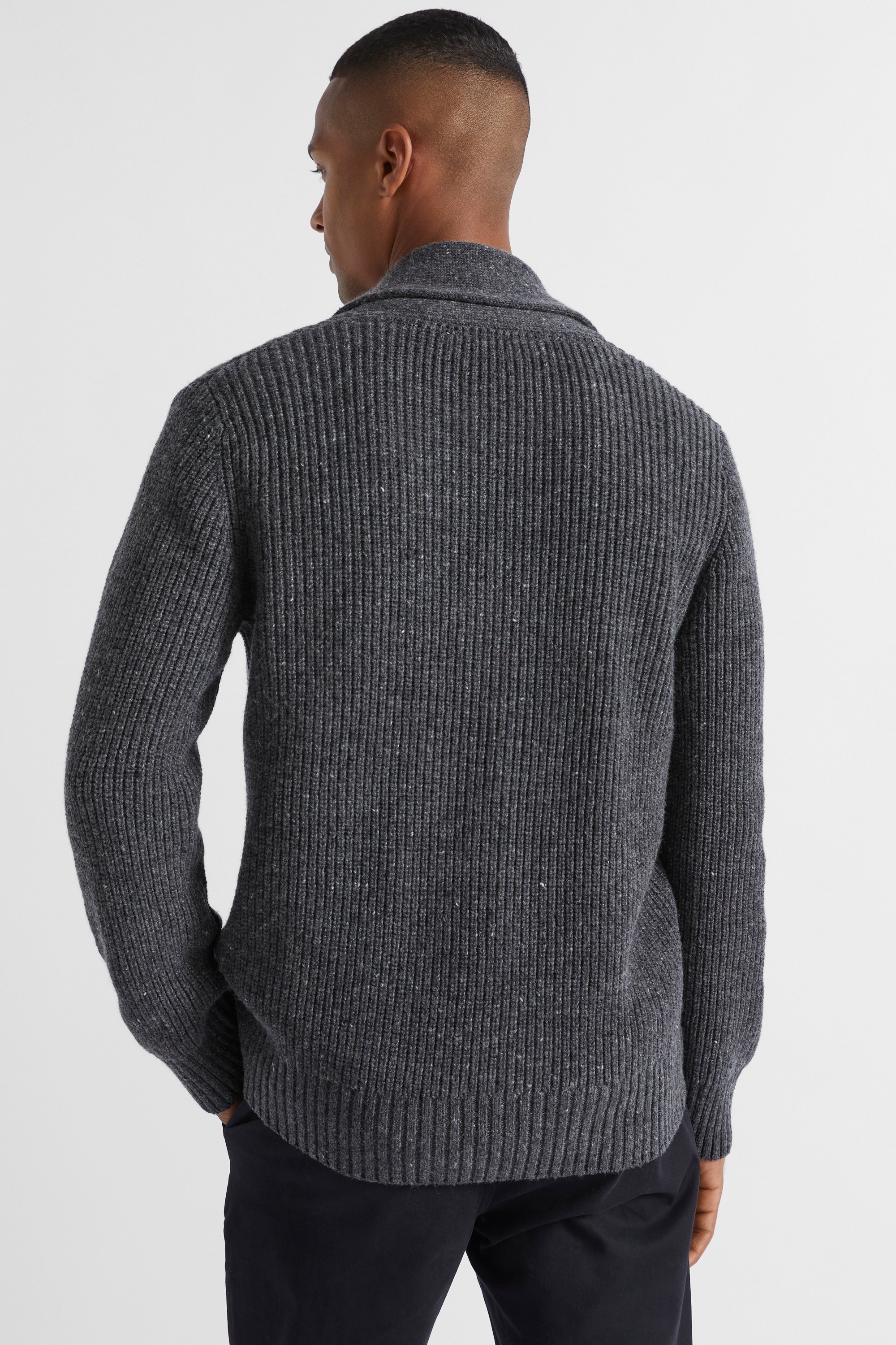 Classic and cosy, this cardigan features a shawl neck, dropped shoulders, a button front, front welt pockets, long sleeves, and ribbed trims. With a speckle effect through the fabric, it is crafted from a wool and cotton blend.