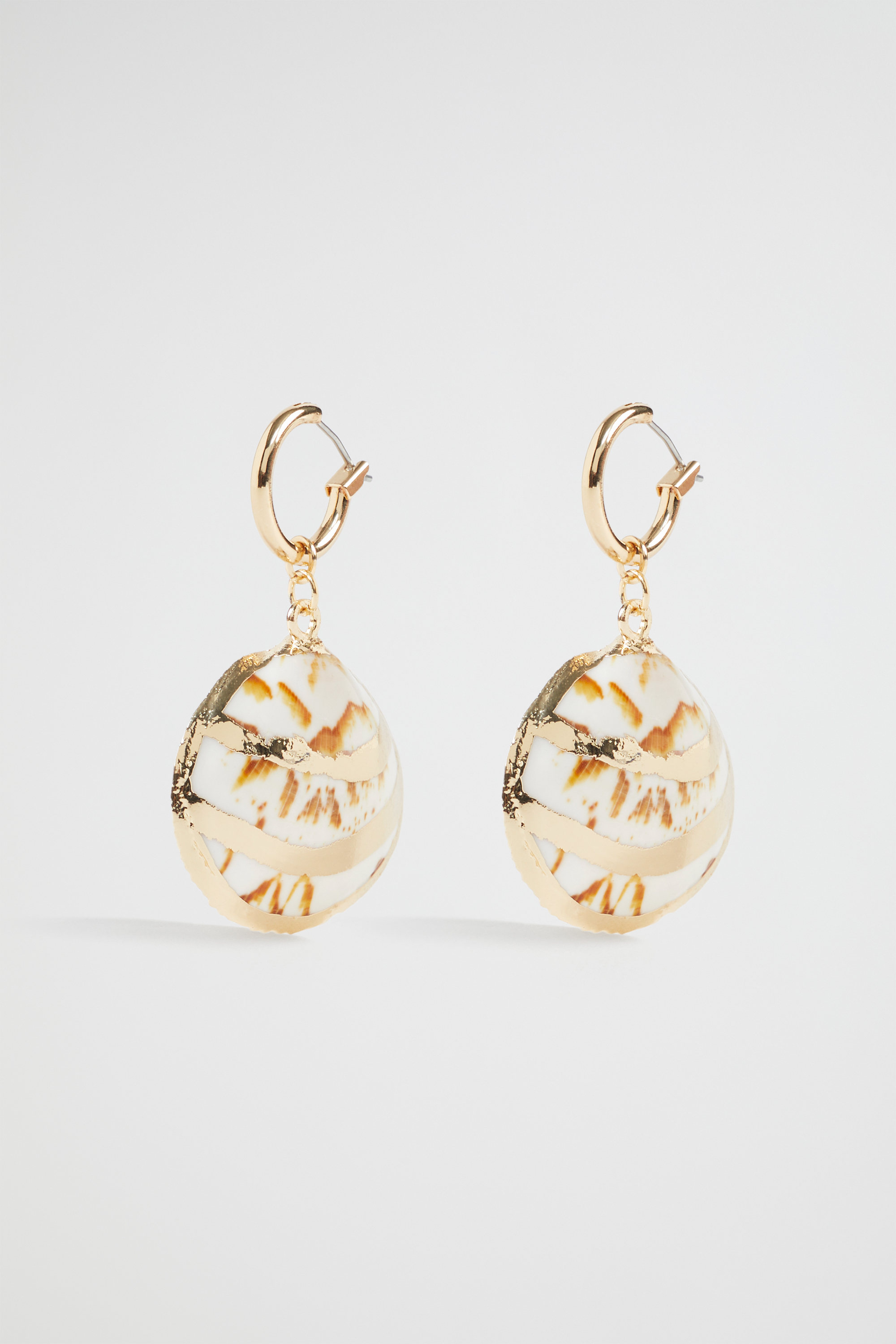 Finish your look with these shell earrings. Made from natural shells with gold painted details, they are designed to dangle from a small hoop.