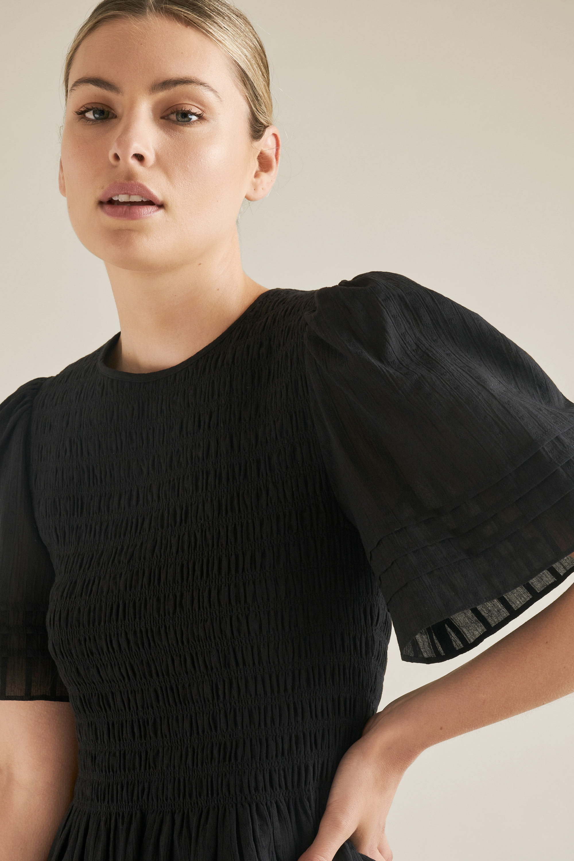 Crafted from a shirred 100% cotton fabrication, this Shirred Blouse is detailed with flutter sleeves and a delicate button fastening to the nape.