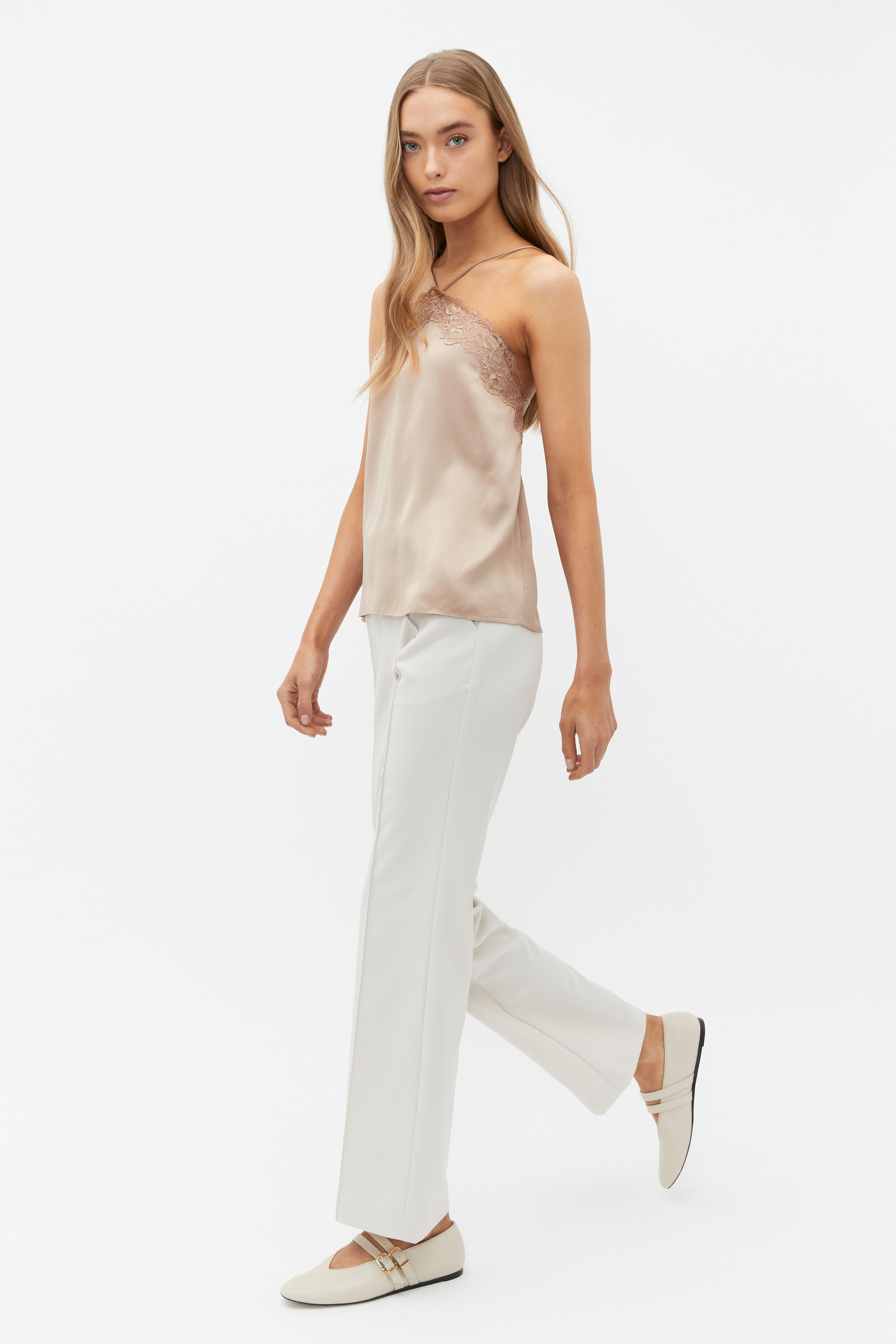 Accented with a lace trim, this camisole is a simple and sleek design for elevated styling. Crafted from premium silk, it features a halter neck with spaghetti straps.