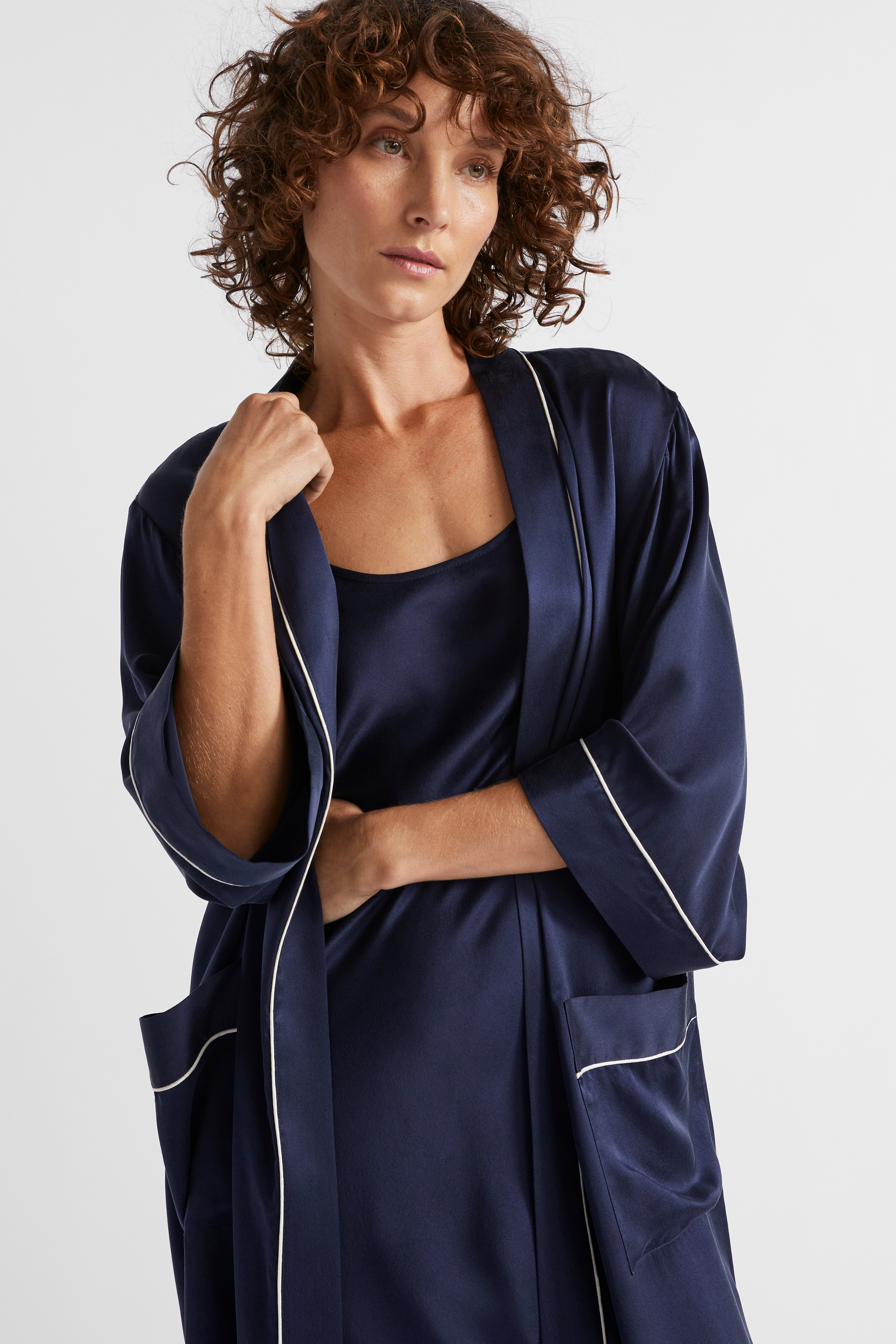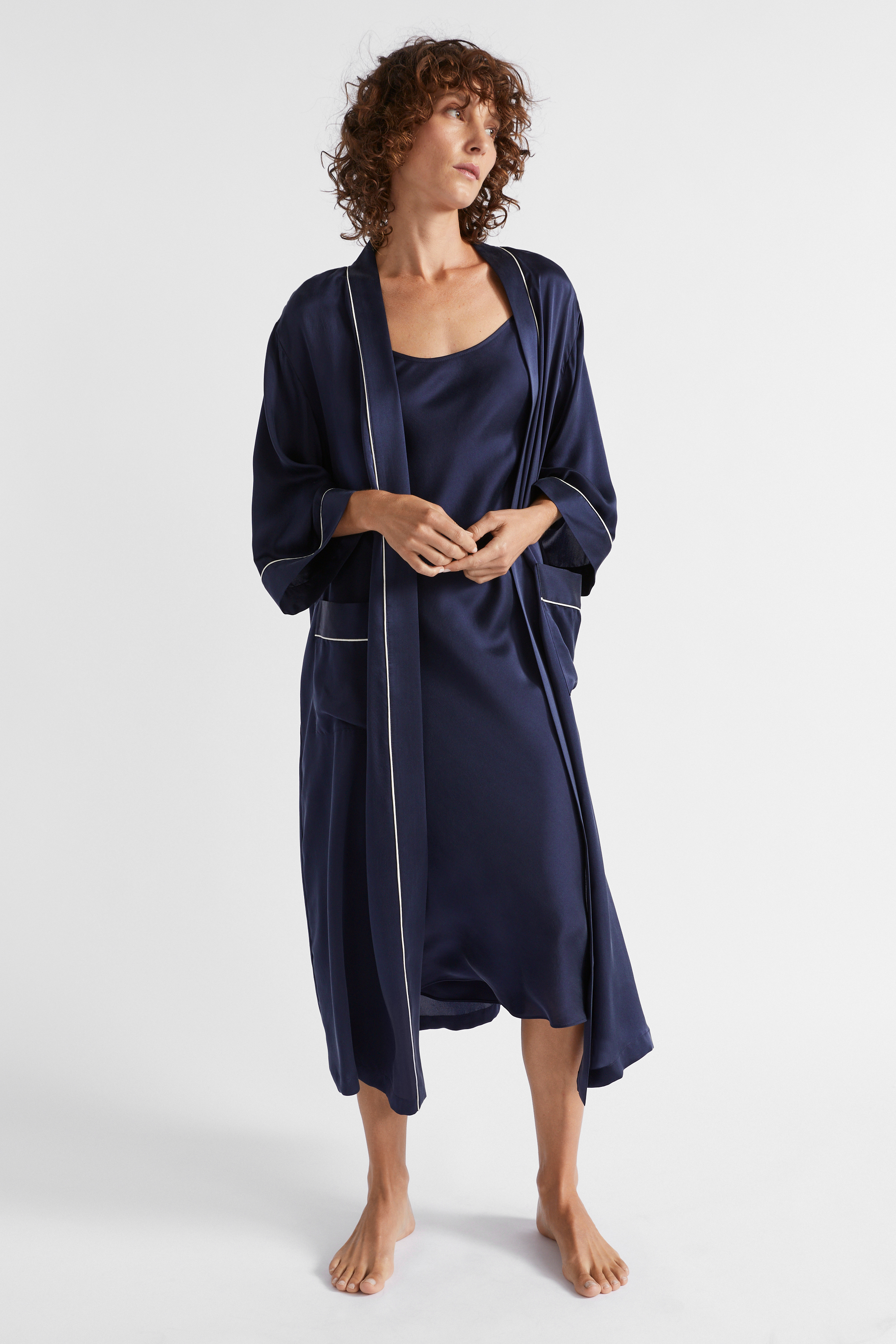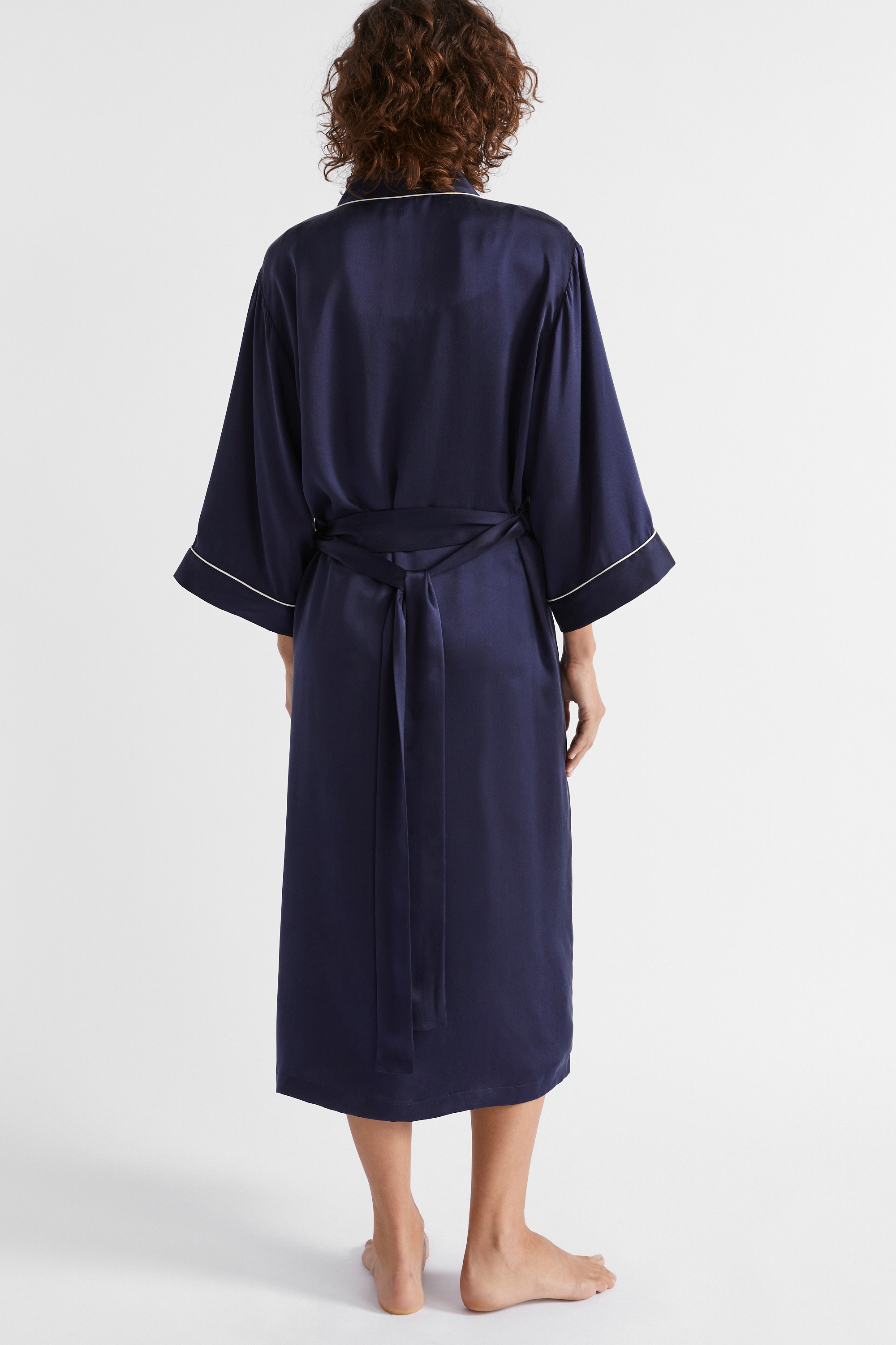 Luxurious and lightweight, this robe is crafted from premium silk. It is a wrap-around style with a self-tie, wide sleeves, front patch pockets, and contrast piping. Pair it with the matching pyjamas or nightie for the ideal gift set.