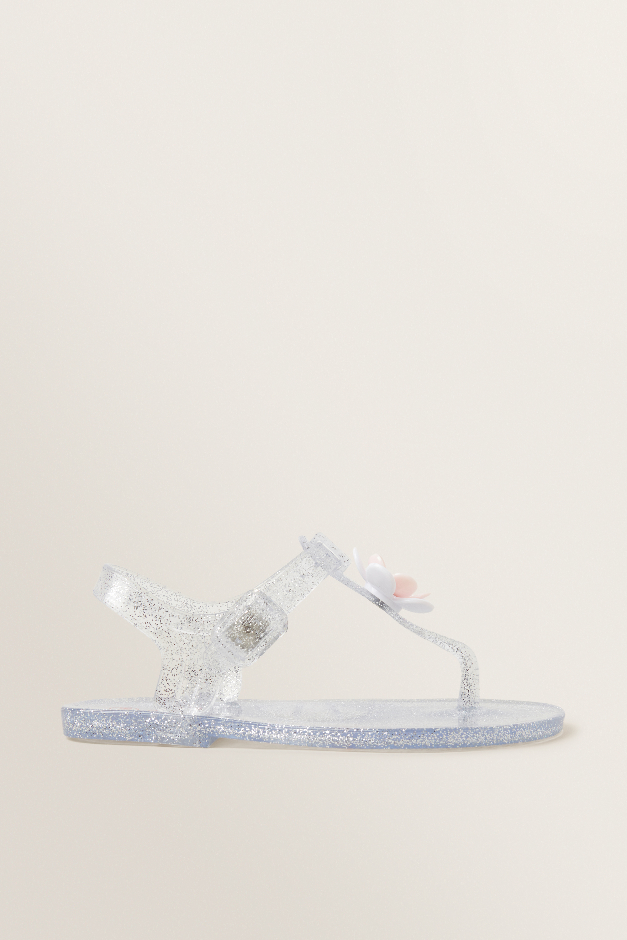 Designed with lustrous detailing, these Silver Jelly Sandals feature a soft jelly sole, ankle strap and flower detailing.