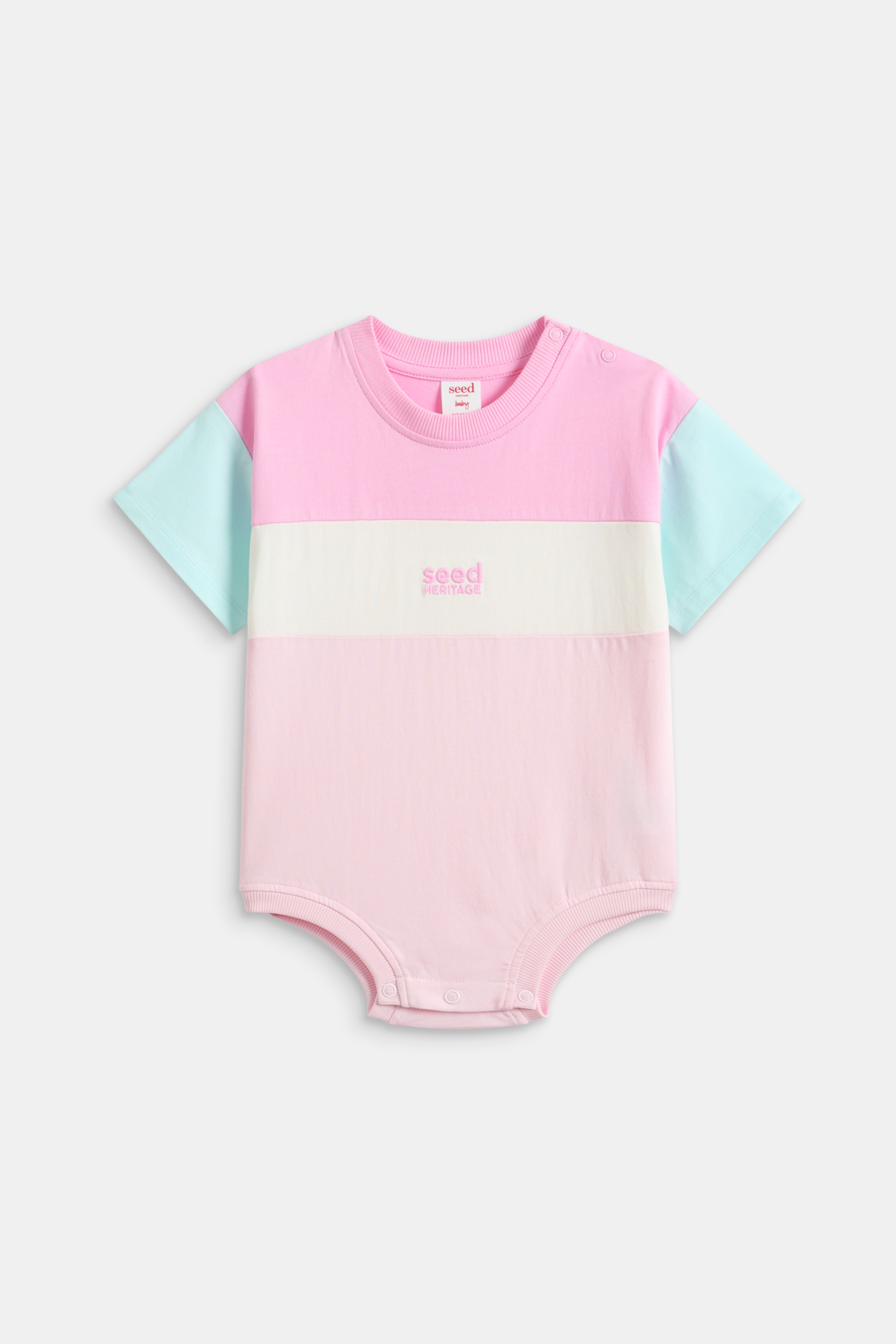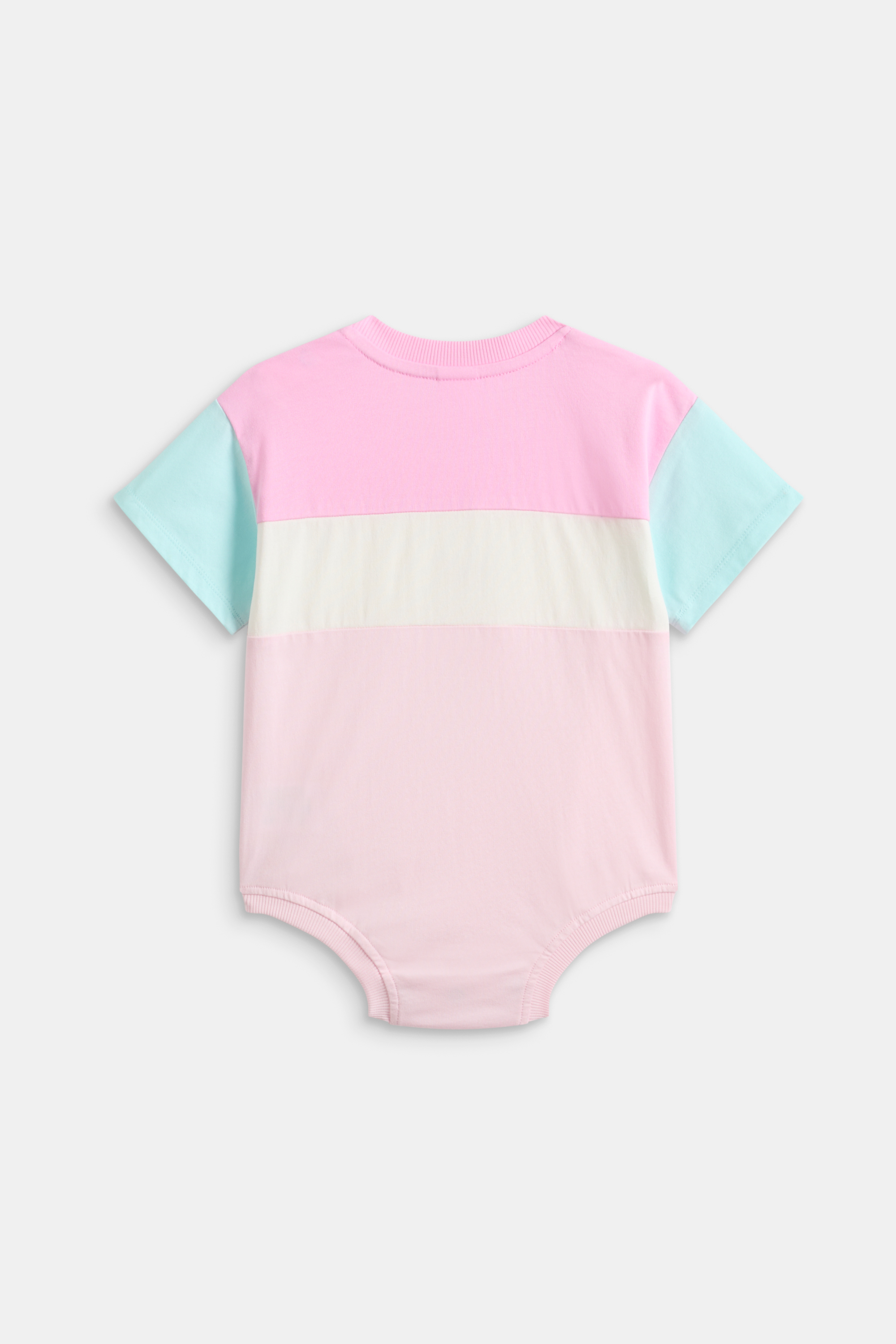 Add some fun to their summer wardrobe with this adorable colourblock romper. Crafted in a comfortable cotton rich blend, it features a round neck with a ribbed collar, short sleeves and elasticated leg openings. With a relaxed fit and snaps at the gusset and neckline, it's an easy option for quick and easy changes.