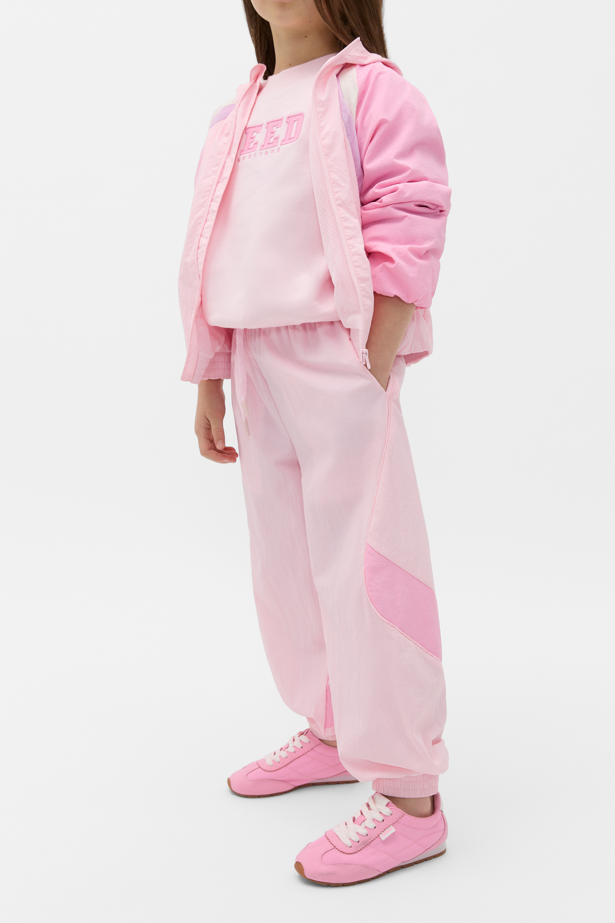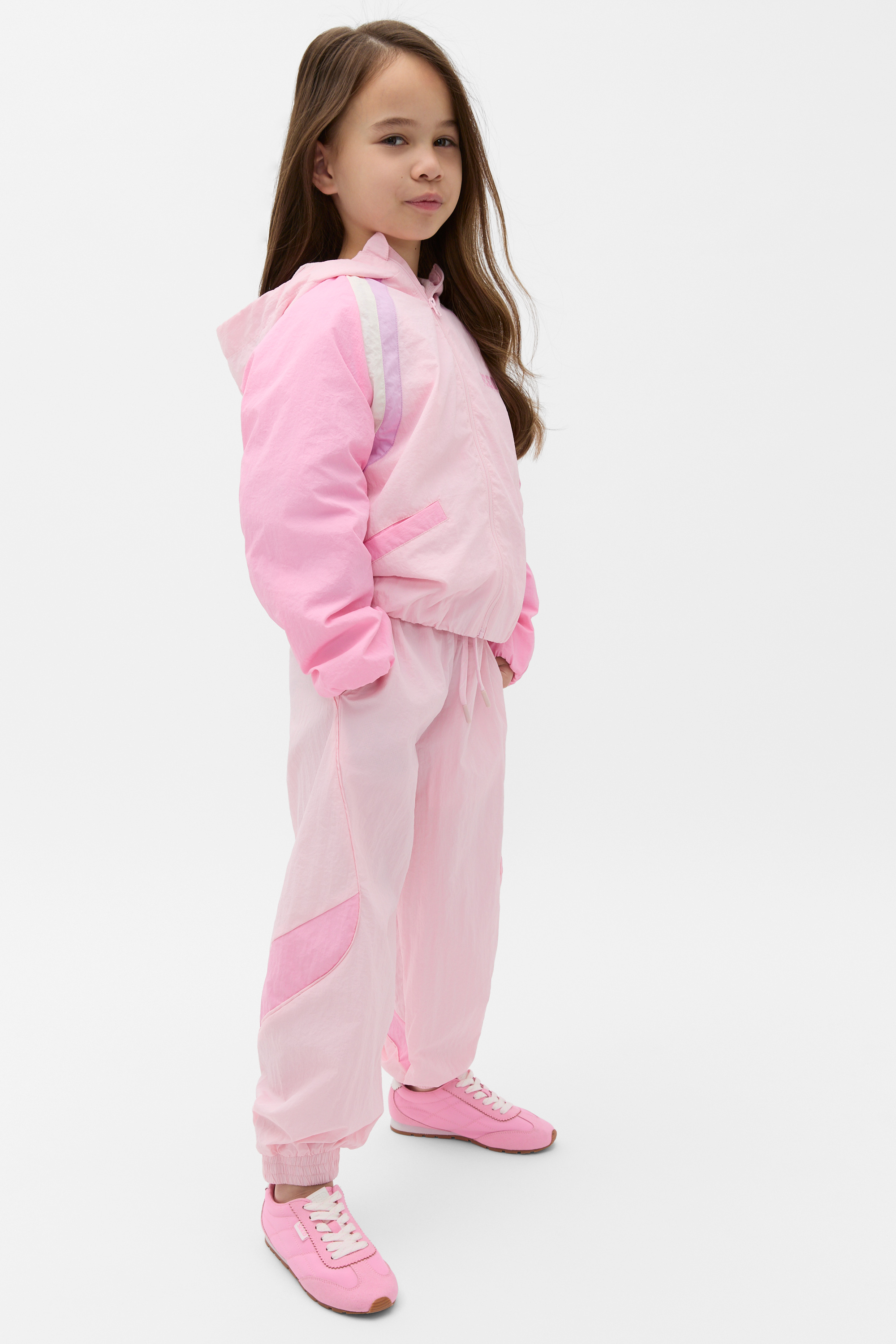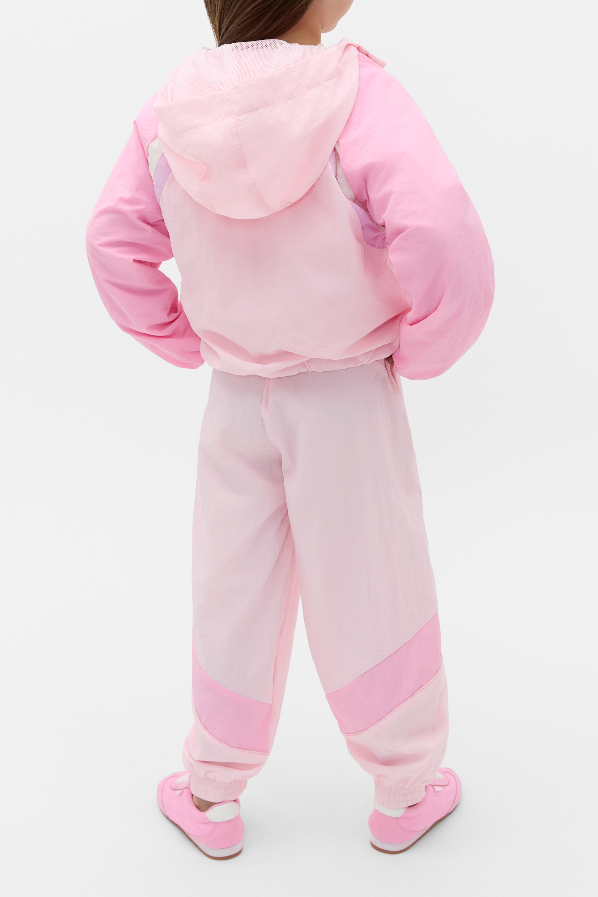 A trending style with a retro feel, these sporty pants are made for days at play. Crafted in nylon, they feature an elasticated waistband with a drawstring, pockets and elasticated cuffs at the ankle. Style with the matching spray jacket for the cutest head-to-toe set.